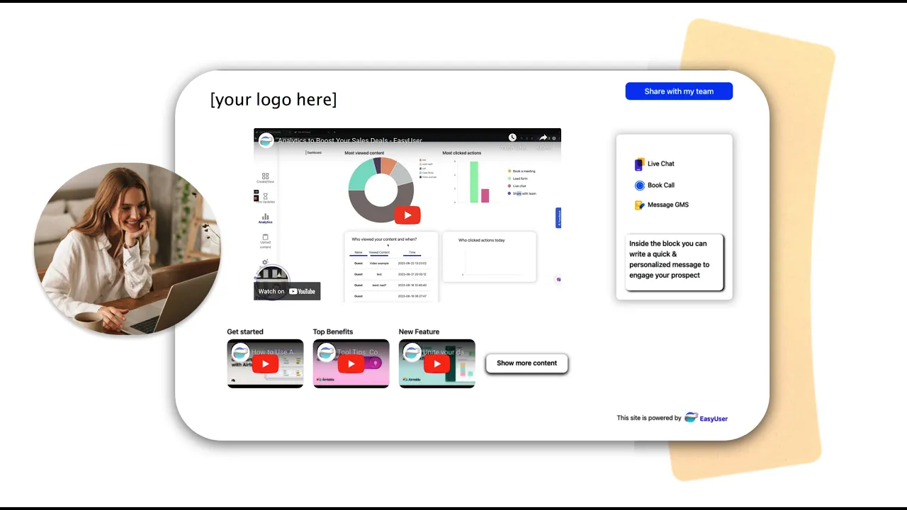 EasyUser is the ultimate sales and marketing tool. Close more deals, in record times. It's directly integrated with your CRM. Ready to create unique content showcases that capture & engage leads in seconds. On each showcase, leads can virally share your content with decision makers, ask questions, book meetings & more. And you get analytics on opened links, most viewed content, buying interests etc… It’s still in beta & we’d love to see if you like it. Try it for free here: easyuser.co/account/signup/php