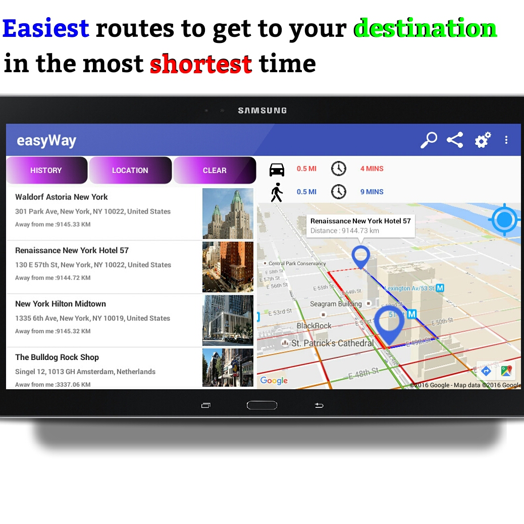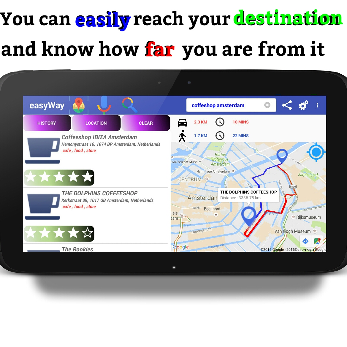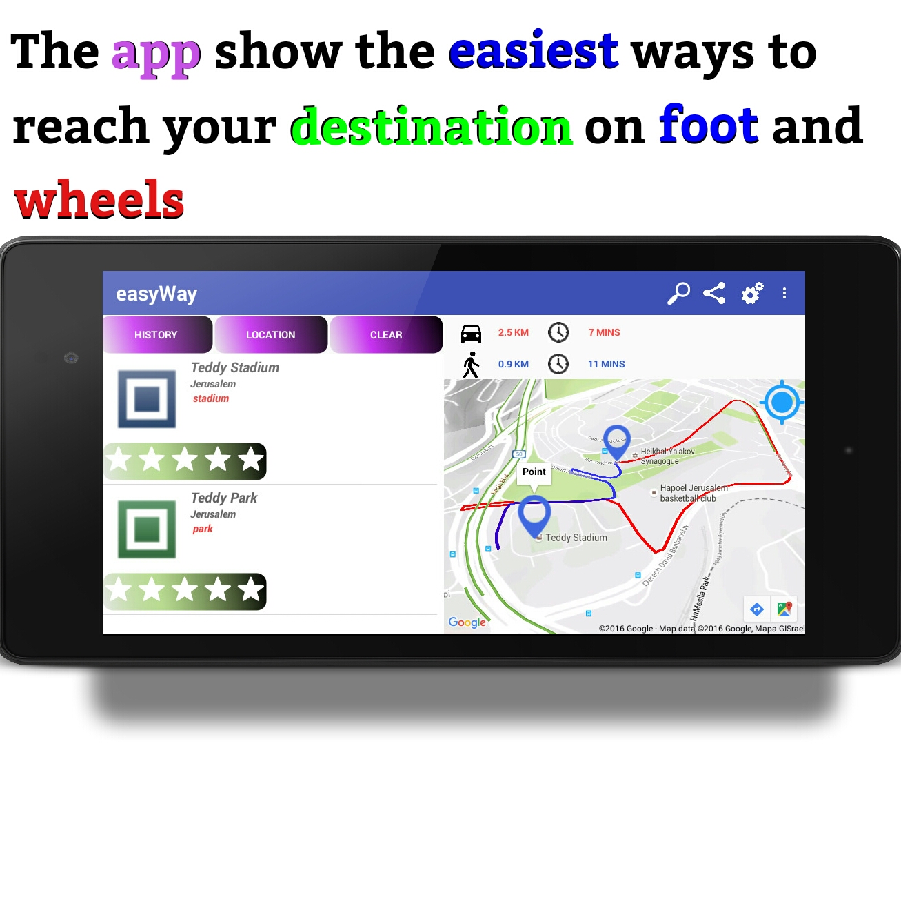 easyWay is a free app aimed at helping you navigate the places all over the world easyWay allows you to search according to a certain category such as Bank \ Street \ Store \ gas station \ bus stop and more. easyWay provides you with three different search options and increases the chances of finding a specific place to 100%! After finding the place there is two ways to reach your destination (feet, wheels) Every route directed you on fast and safe way! The advantages of easyWay : √ You know where you are located exactly on the map √ No GPS reception issues √ You can know how long your destination far from you while refreshing the screen (Swipe) √ The possibility to reach your destination on foot very necessary especially because is different route from driving √ Three search options are great to get the most places all over you. easyWay translated into the following languages: ? English ? Hebrew ? German ? French ? Italian ? Portuguese ? Dutch ? Spanish ? Korean ? Chinese ? Japan