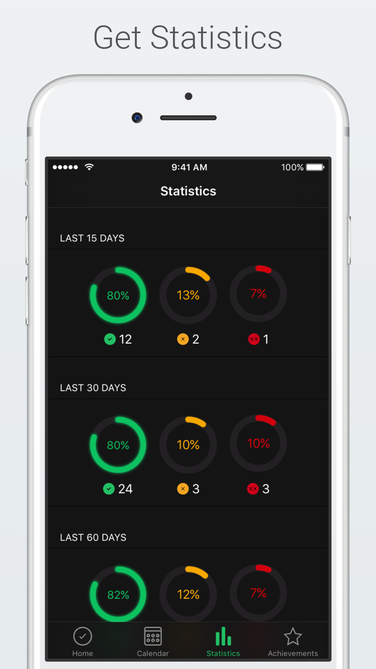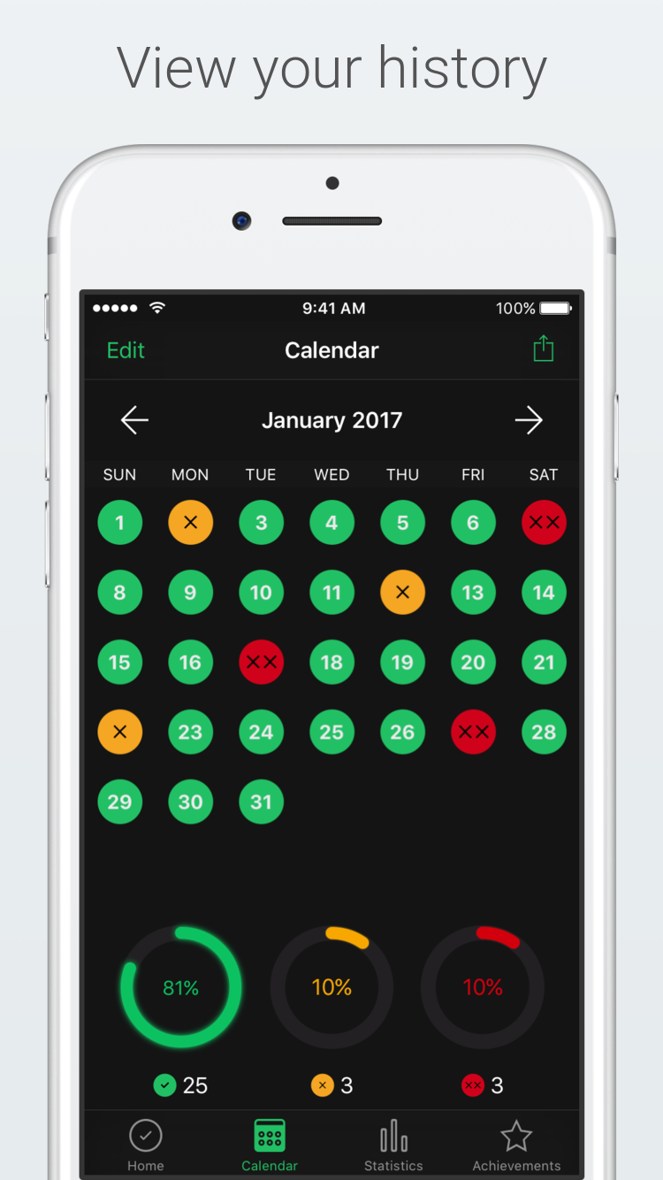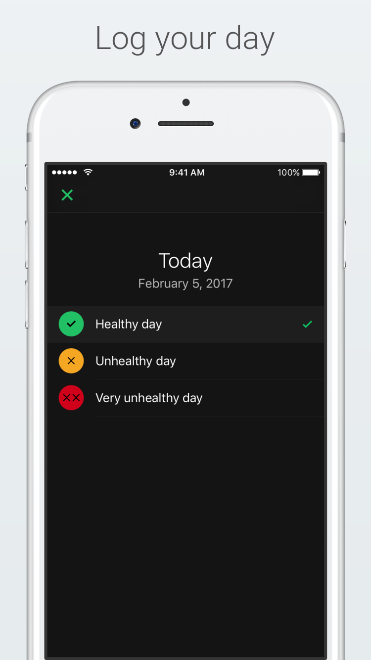 A simple app to keep track of healthy, unhealthy and very unhealthy days. At the end of day, recall your eating choices during the day and take a "conscious" decision to rate it healthy, unhealthy or a very unhealthy day. Features: + Calendar with breakdown of healthy, unhealthy and very unhealthy days + Statistics for last 15, 30 and 60 days + Goals and achievements + Beautiful backgrounds + Minimal interaction: Log your day directly from the reminder notification or using force touch on app icon