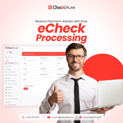 eCheckPlan’s eCheck Payment Processing Services enable businesses to accept secure bank payments online without relying on traditional ACH or card networks. Using an RCPO-based digital check system and Check 21 compliance, merchants can generate, verify, and process electronic checks through a virtual terminal, invoice links, or recurring billing. The platform is ideal for high-ticket and high-risk industries seeking lower returns, greater payment control, and cost-effective transaction processing.