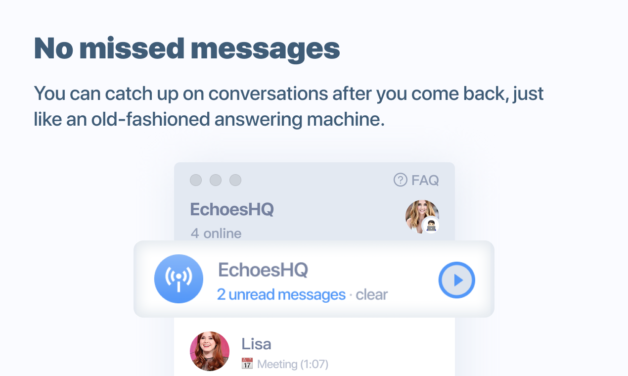 Echoes enables remote teams to communicate seamlessly and quickly through a walkie-talkie-like experience, just like sitting next to teammates, thereby facilitating collaboration and speeding up decision-making.