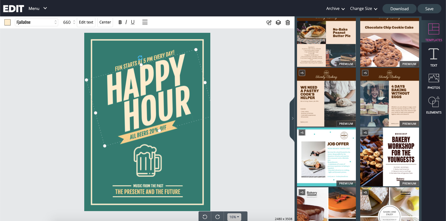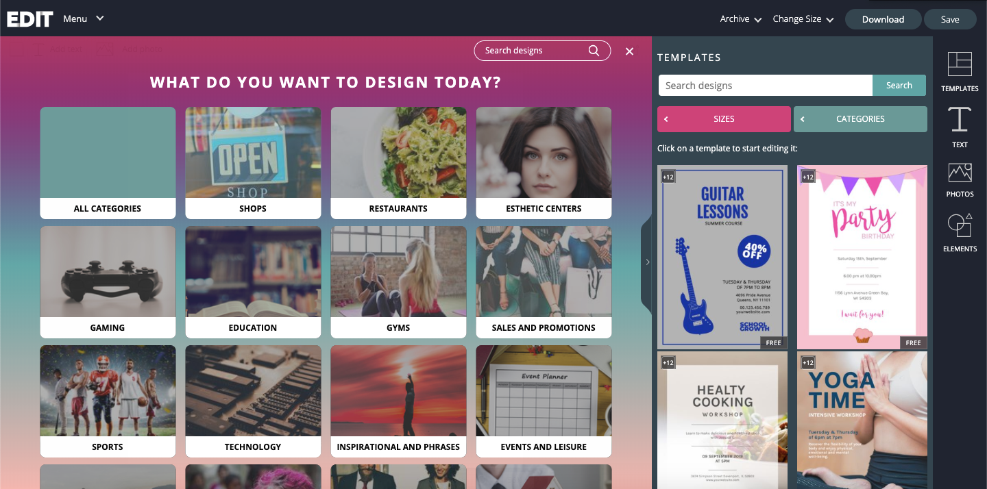 With EDIT, you can create your own professional designs, choosing from thousands of designs that you can adapt to your needs in a few seconds and without knowledge of graphic design. Companies, shops, restaurants... that don't have the resources to hire a designer but want to have a beautiful image and at a very low cost can enjoy EDIT. Thousands of free designs, all free images and much more.