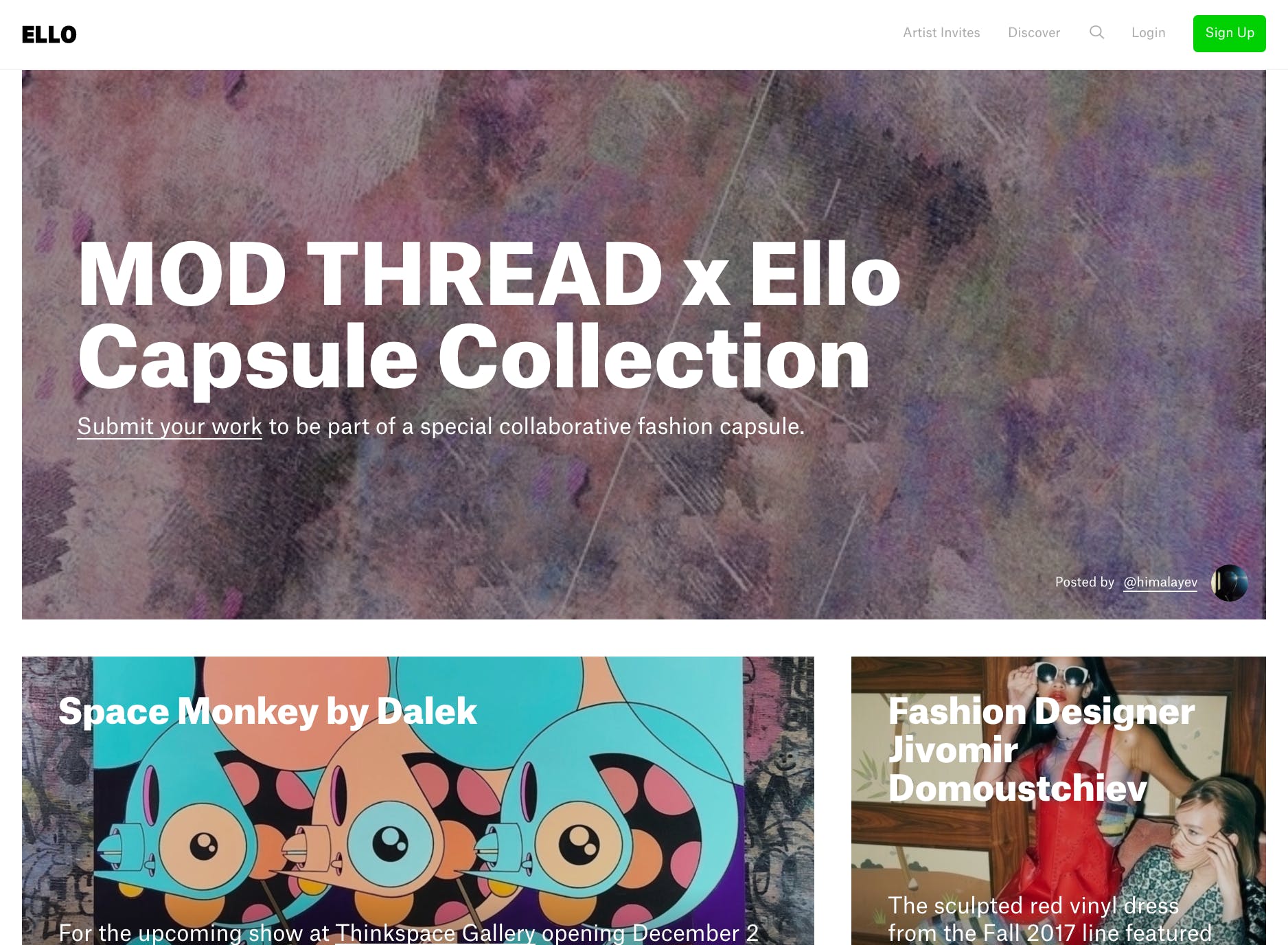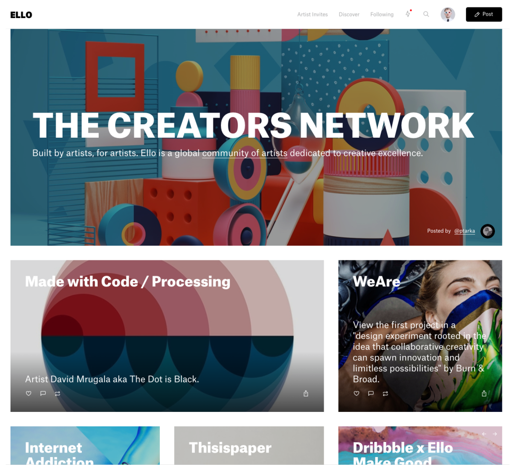Ello is The Creators Network, a publishing and collaboration platform connecting and supporting a global community of artists. You’ll see a “Discover” section at the top of the home page. Click it and you’ll come to a page where you can dive deeper into art, photography, written works, illustration and a bunch of other types of creative outlets. You can then dive into individual artist portfolios from there.