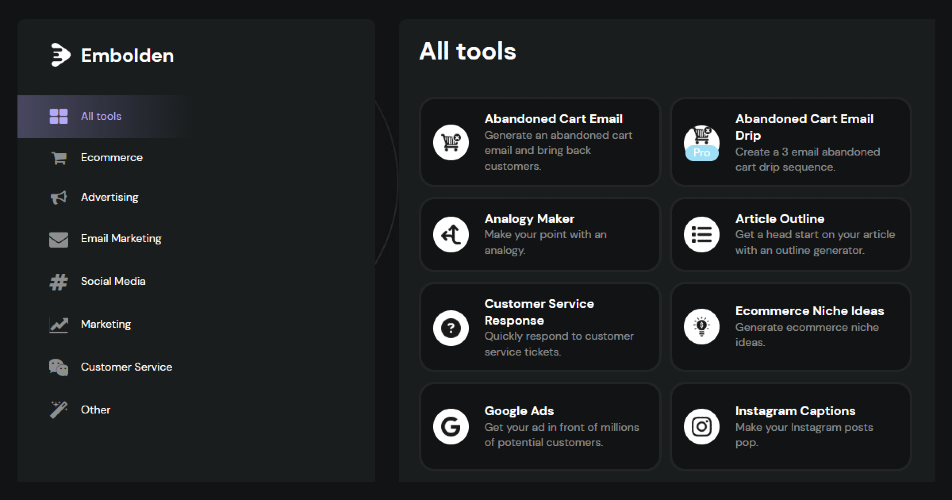 Use AI to power your ecommerce writing. Embolden uses AI to help you write everything from emails to product descriptions for your ecommerce business.
