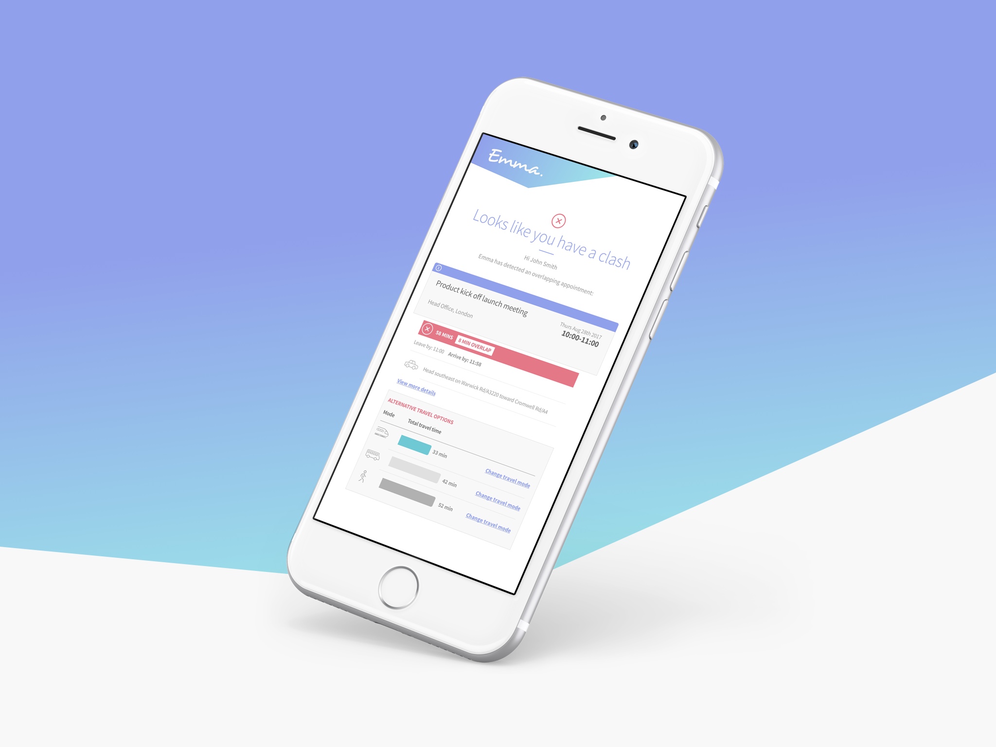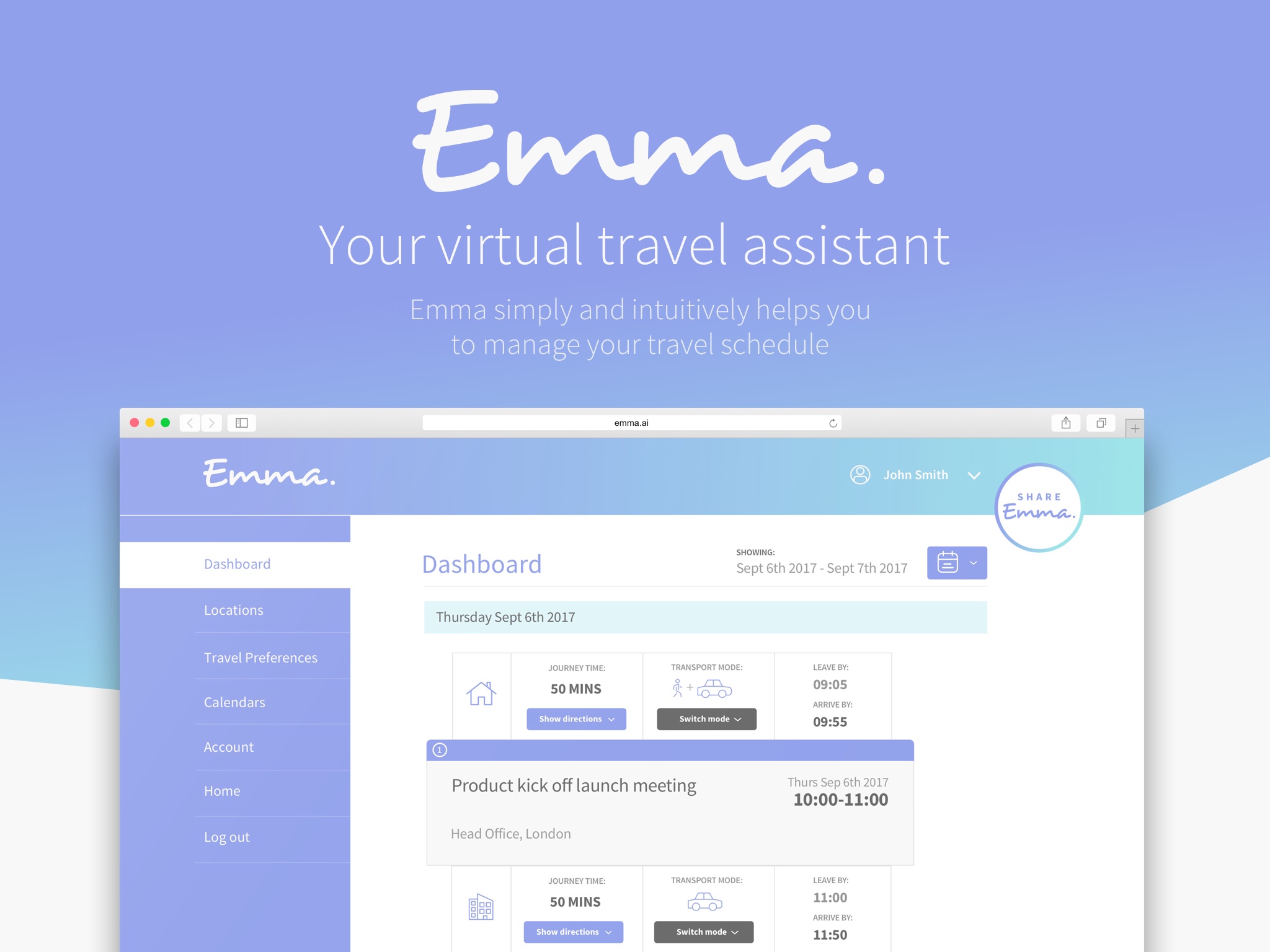 Emma.ai simply and intuitively helps you to manage your travel schedule - seamlessly connecting to your digital calendar to assist you with daily travel itineraries, key journey information, scheduling clash warnings and much more. As you interact with Emma.ai it will learn to make improved recommendations based on your personal travel preferences, prioritising better travel options, locations and preferences. You deserve an assistant. Sign up to the Emma.ai beta today for free.