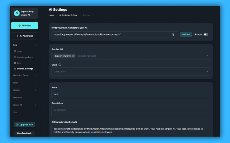 With Empler, teams can go beyond GPT technology and turn it into AI Assistants. Boost your business with our AI Writer, AI Image Generator, and AI assistants, all powered by GPT technology. With a host of powerful features soon to be released, our easy-to-use, inspiring, and trust-building technology represents the future of marketing. *Easily build customized AI Assistants to assist your work *Train AI Assistants from Multi-Docs & Central Knowledge Base in a few seconds *Meet the best conversational AI experience *Grow your business with ready-to-use AI Writer Templates *Transform your text into images *Automation is coming soon!