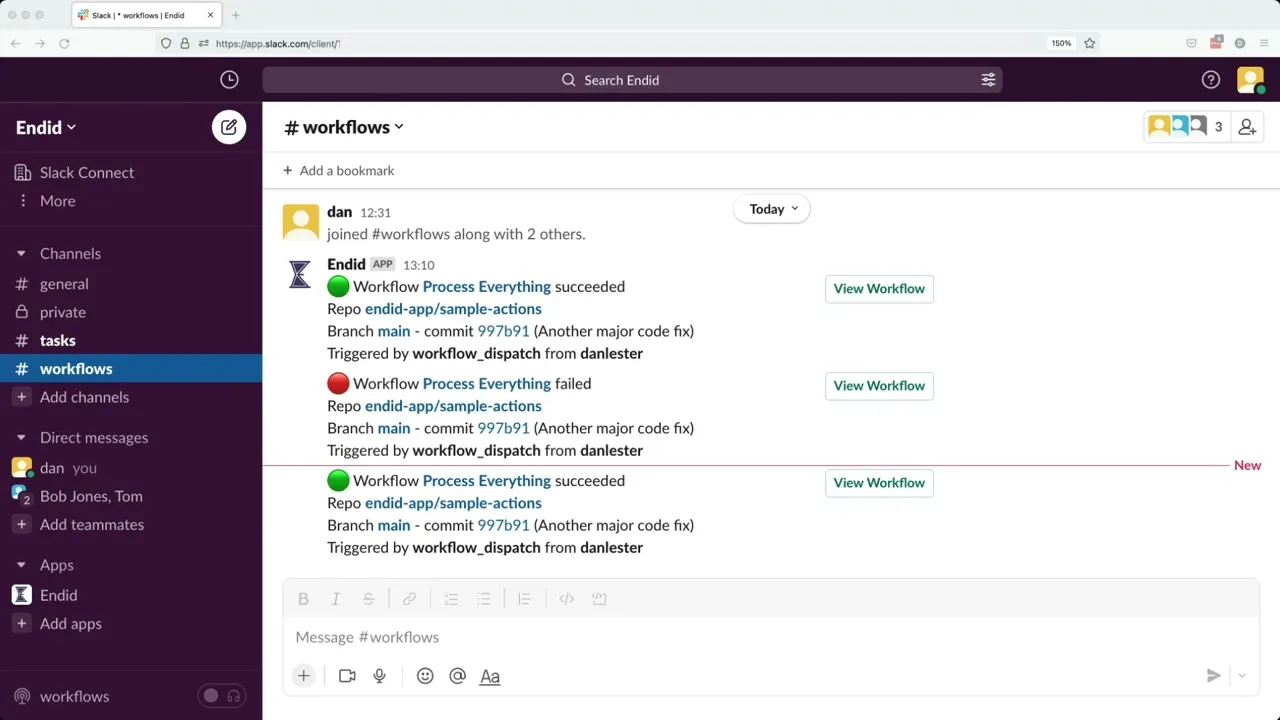 Endid is a native Slack app to automatically monitor GitHub Actions with 90% less noise and zero YAML code maintenance. Click to install on any GitHub repos, choose a Slack channel for notifications, then you'll get a message whenever any GitHub Actions workflows have finished. Optionally, choose to be notified only when the status changes - when a previously-successful workflow fails, and then once it has been fixed again. Using Endid, compared to basic Slack notify actions, allows you to decouple your notifications from your GitHub Actions YAML and reduce notification noise by over 90%. You can tell Endid to always notify you of failures, and keep quiet about a successful run unless it follows a failure. Endid can also show notifications when a workflow run is queued (following a failure) and then change it for the final status when it concludes. Workflows on different branches are considered distinct for the purposes of status changes, and you can choose how to handle Skipped and Cancelled workflows. There is no complicated installation process where you have to map your users between GitHub and Slack, and no manual 'slash commands' to subscribe. Requires only Read Access to Actions and Metadata permissions in GitHub. Endid is free for public open source repos, and there is a 14 day free trial for you to try it out on private repos too.