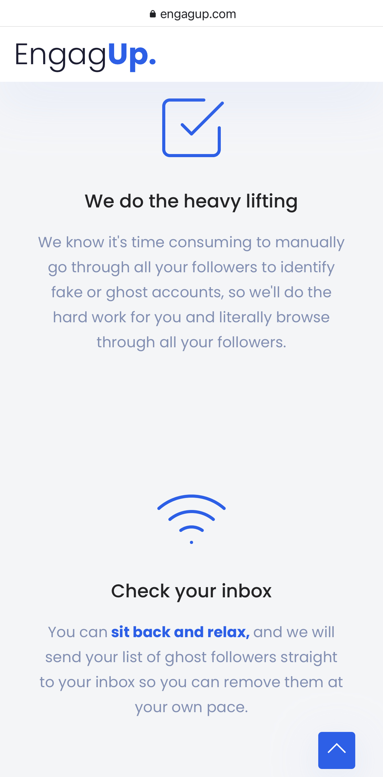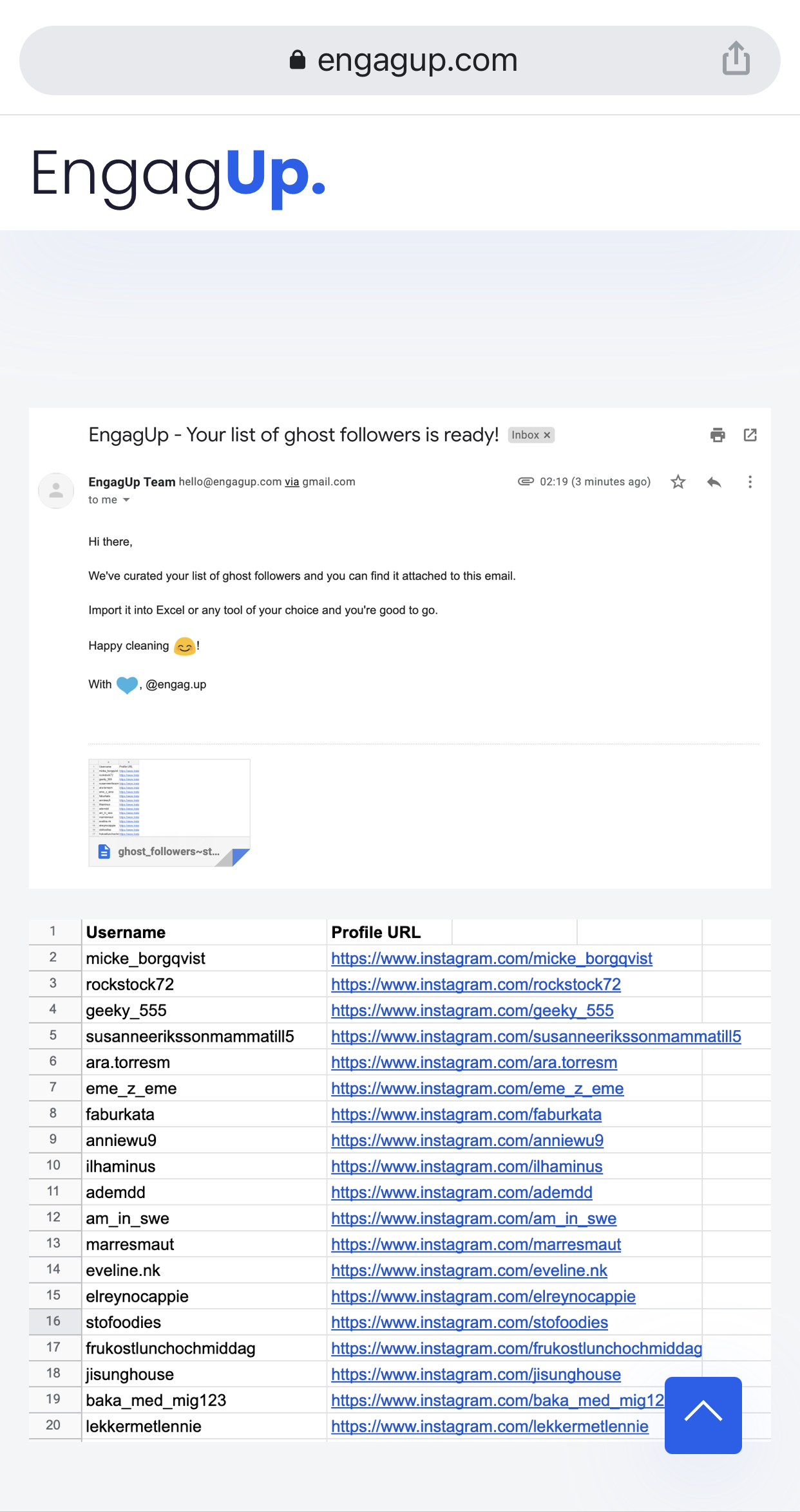 EngagUp scans through your Instagram account and sends you a list of your ghost followers. Cleaning your ghost followers regularly protects your brand, boosts your engagement and increases the visibility of your posts.