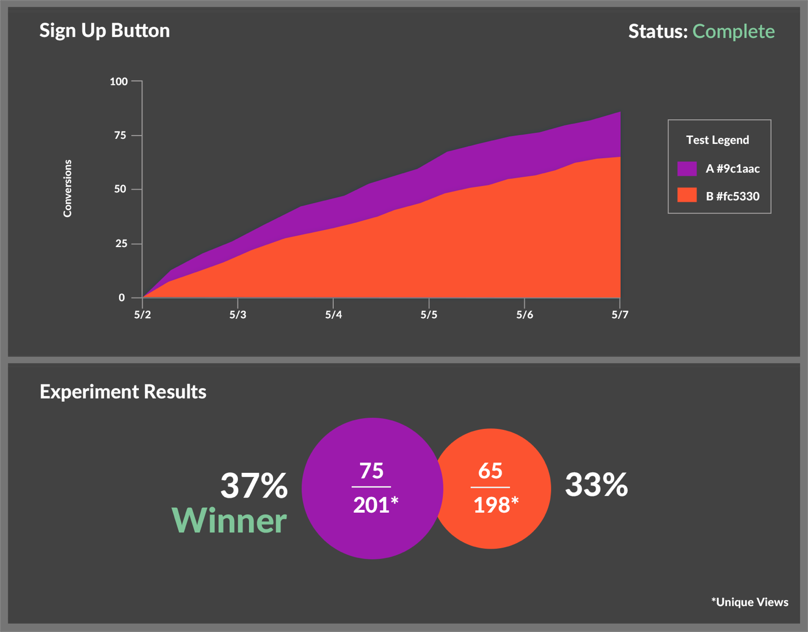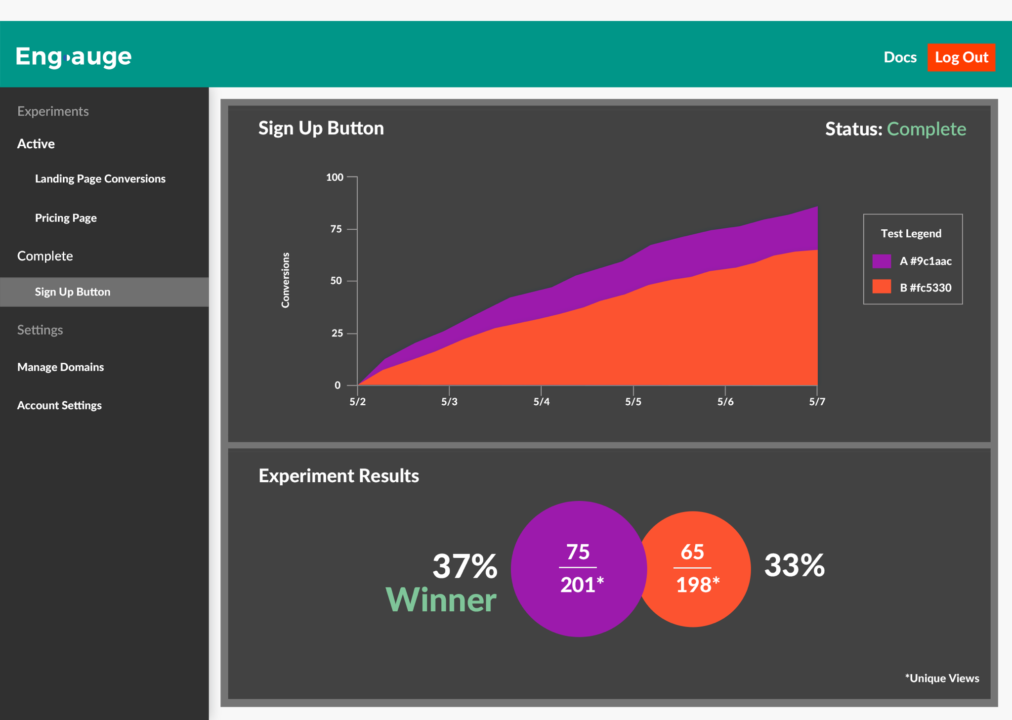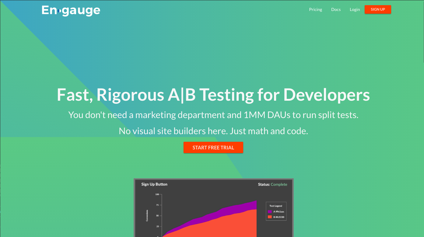 Engauge is an A/B testing platform built with developers in mind. Easily hook into our bucket selection callback and display the relevant UI with whatever flavor of JS you prefer. We run a highly optimal sequential sampling algorithm to give you powerful, actionable feedback freakishly fast. Our motivation in building Engauge was that tools like visual website builders come with a lot of overhead when automatically switching view components out on the fly. As developers dedicated to creating great UX for our customers, this was a huge problem for us. Engauge aims to solve that. We're currently working on bringing more tools and algorithms into our system for your use. Up next is a multi-bandit with pure exploration, followed by implementing an exploitation phase without adding too much overhead. Thanks for your time, enjoy!