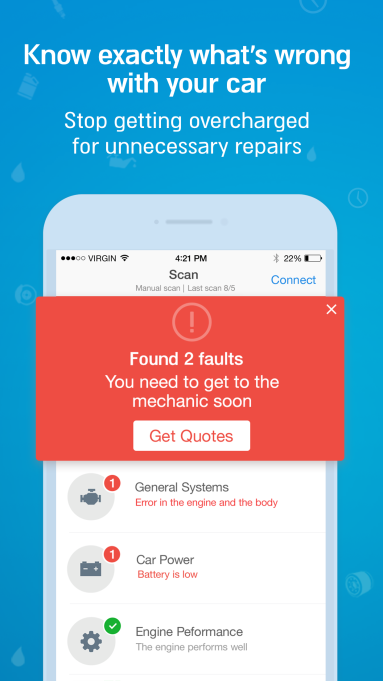 Overcharged on car repairs? Engie takes the stress and trauma out of fixing your car and saves you money on repairs and maintenance. Engie connects to your car and offers an extensive auto repair and maintenance solution, from malfunction diagnosis to real-time quotes from nearby mechanics. Engie connects to the car via Bluetooth device, which you can buy through the app and that plugs under the dashboard. The device is small and simple to connect. After the connection is established with your car, our system provides reliable information about the car's health.