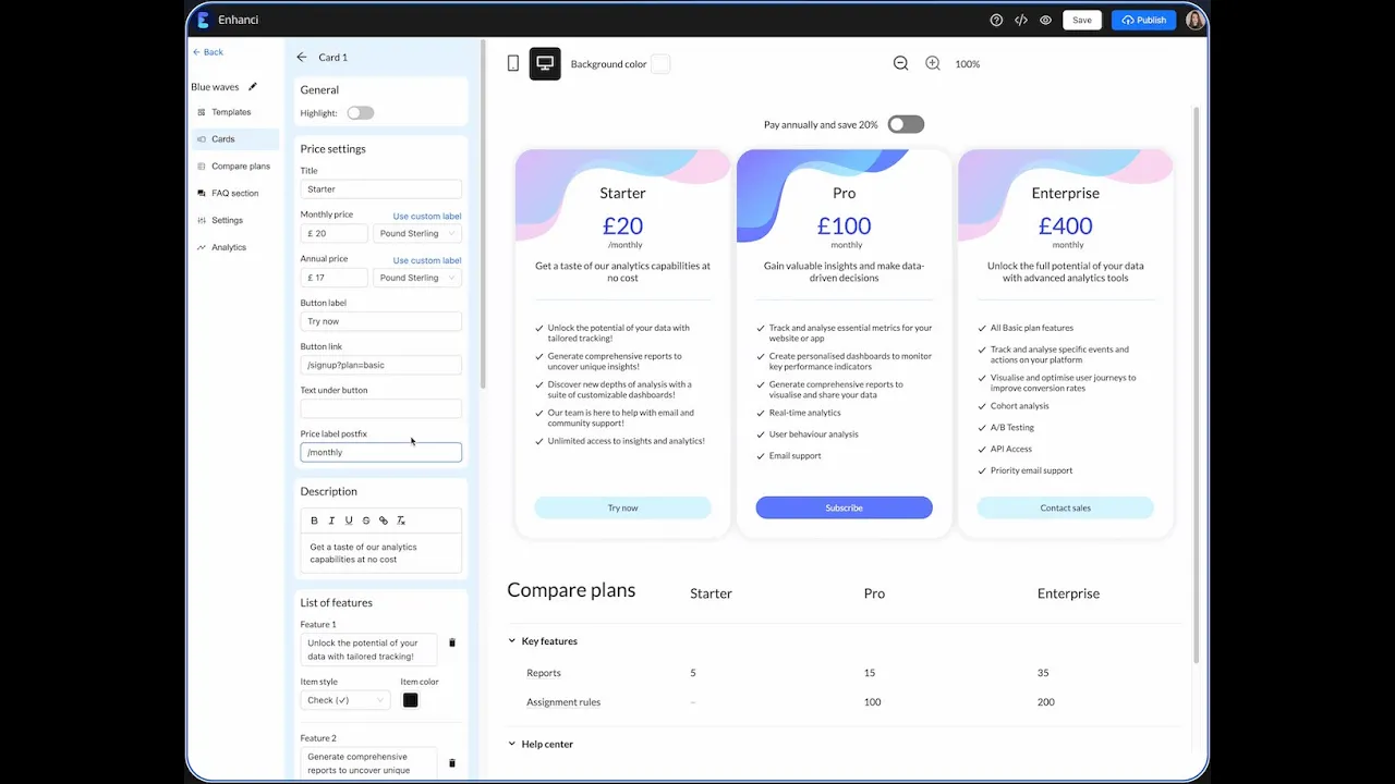 Enhanci is a tool designed to build beautiful pricing tables using modern design templates, customize them to match your brand, run A/B experiments to discover which design/copy/prices bring in more customers and revenue