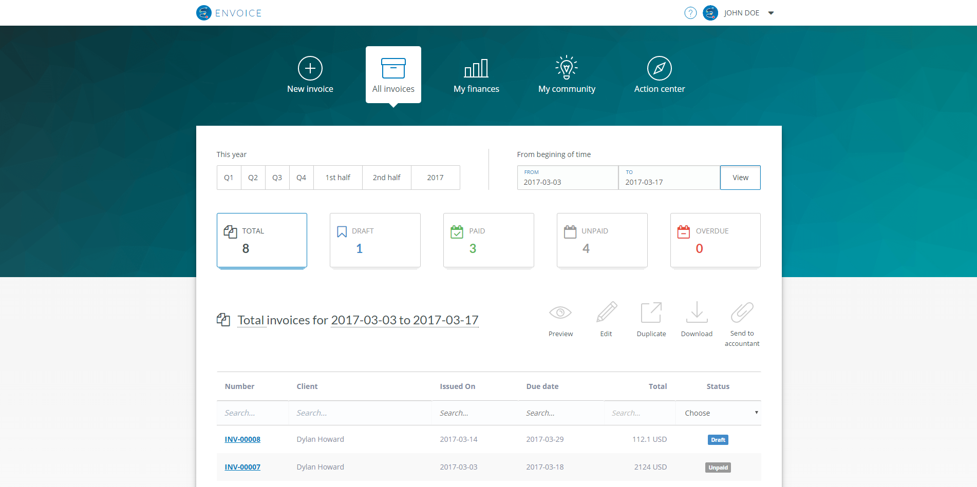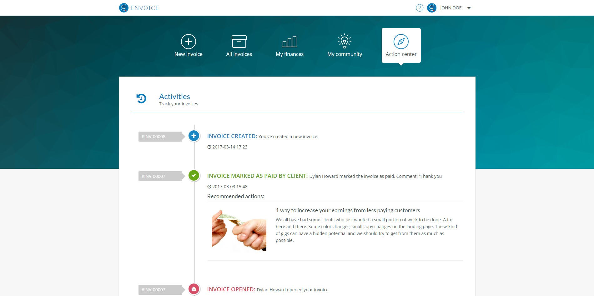 Envoice - invoicing application for freelancers. Envoice let professional freelancers to manage their invoices. It is a simple and powerful platform to create beautiful invoices and get them paid on your PayPal, Payoneer, Stripe or bank account.