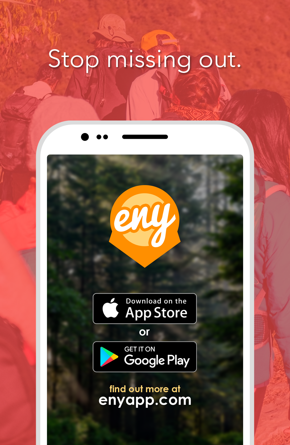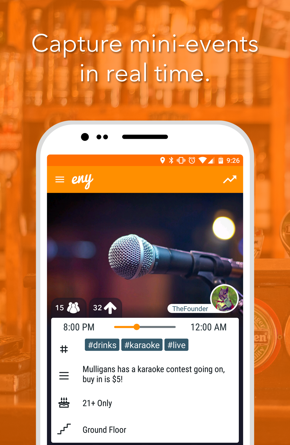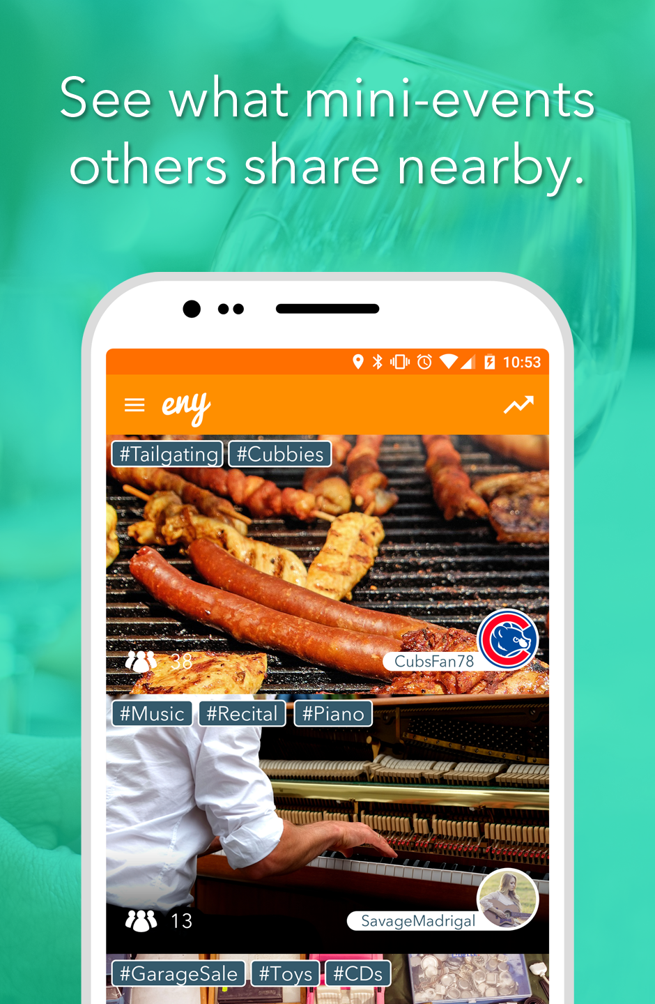 There are so many mini events going on all around you that you miss out on because you don't personally know everyone. ENY is an open community of users sharing rich location markers called Pings: mini events happening on a map. If you're looking for more players for volleyball you can Ping that to others nearby on ENY. If another user Pings that Karaoke started up nearby recently you won't miss out on it. Pings you create have a start and end time and get labeled with hashtags like #Frisbee or #WineTasting so that others can save those tags as interests and be notified when the Pings start nearby them. You can share Pings privately to groups and friends or publicly to everyone in the world. ENY stops you missing out on all the little Pings.