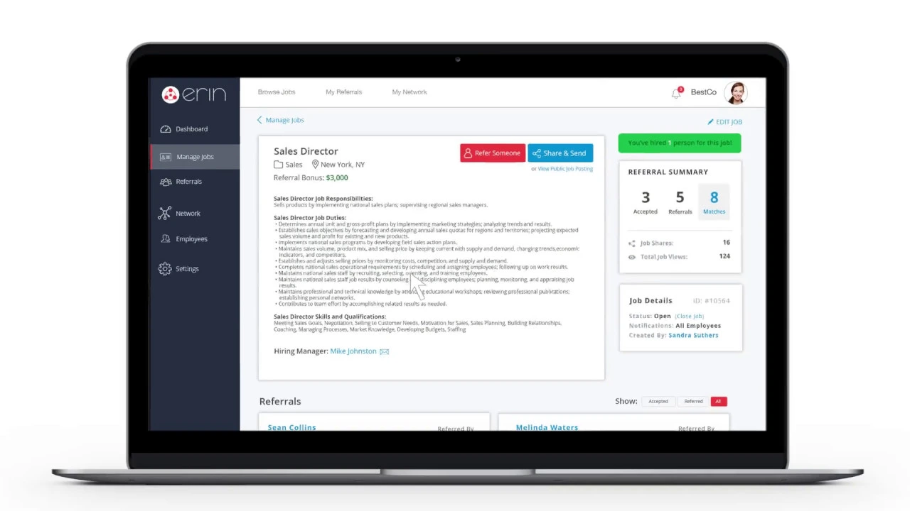 Employee Referrals and Referral Requests The foundation of Erin is an easy to use employee referral management platform, helping you save hundreds of hours of time and headaches sourcing candidates from your employees. The unique power of Erin is the Smart Referral AI engine that helps your employees make meaningful referrals as quickly and easily as possible. For the first time ever you can now ask your employees for specific referrals. Erin will show you what employees are connected to candidates that fit the open position, without exposing their details, so that you can proactively reach out to employees for referrals.