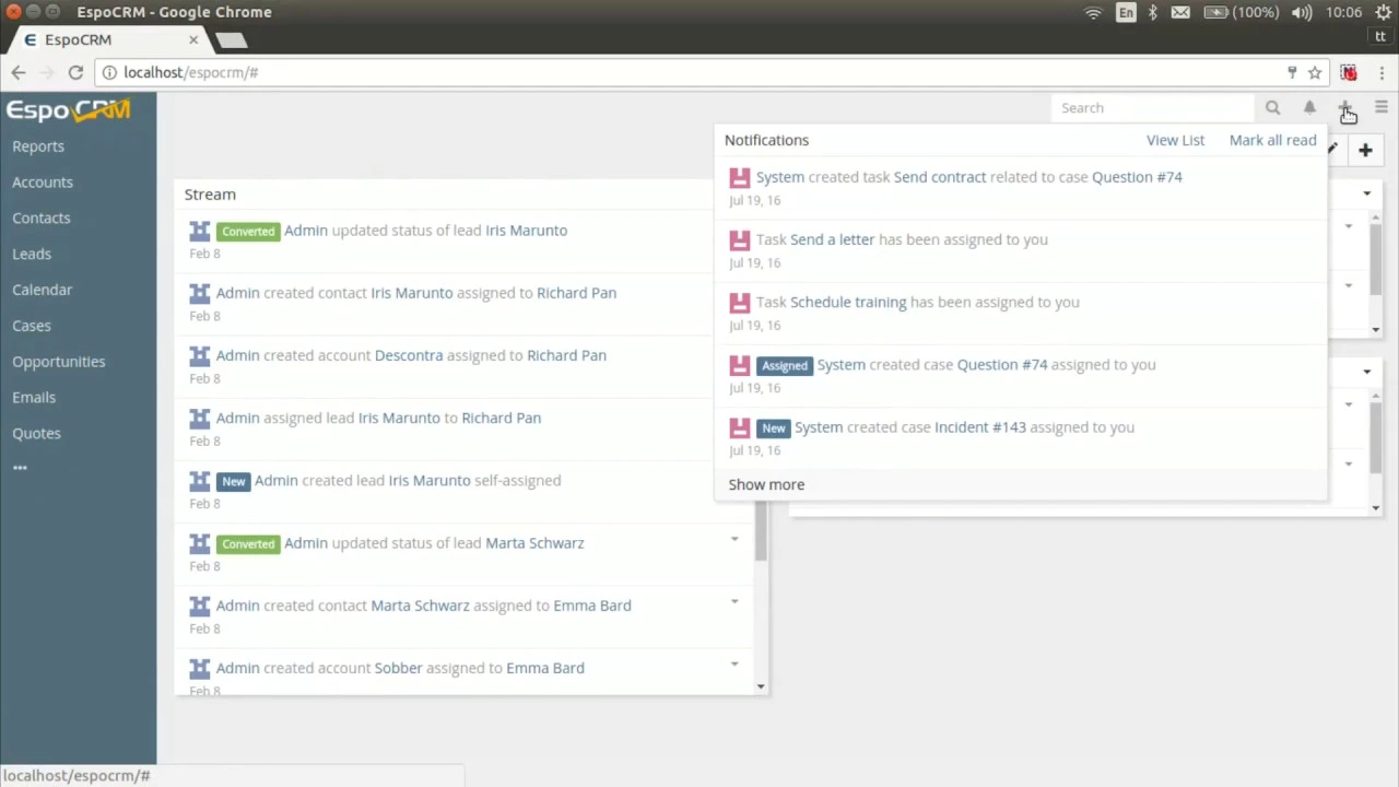EspoCRM is an open-source CRM solution that is used to manage interactions with customers, improve sales performance and increase business profitability. The platform abounds with functionality that improves the work of sales, marketing and customer service divisions of any company. Developed with the needs of small and mid-size companies in mind, EspoCRM represents a cost-effective solution with an intuitive and user-friendly interface and unlimited options for customization.