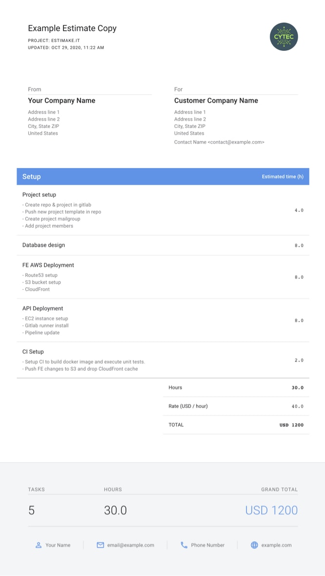As software developers, we usually don't get paid for providing quotes, and creating quality quotes takes time. Estimake offers: ? Real-time editing from multiple team members. ?? Autocomplete tasks from previous estimates. ? Pretty exports.