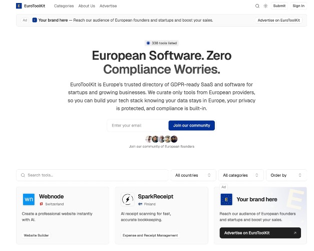 EuroToolKit is Europe's trusted directory of GDPR-ready SaaS and software for startups and growing businesses. We curate only tools from European providers, so you can build your tech stack knowing your data stays in Europe, your privacy is protected, and compliance is built-in.