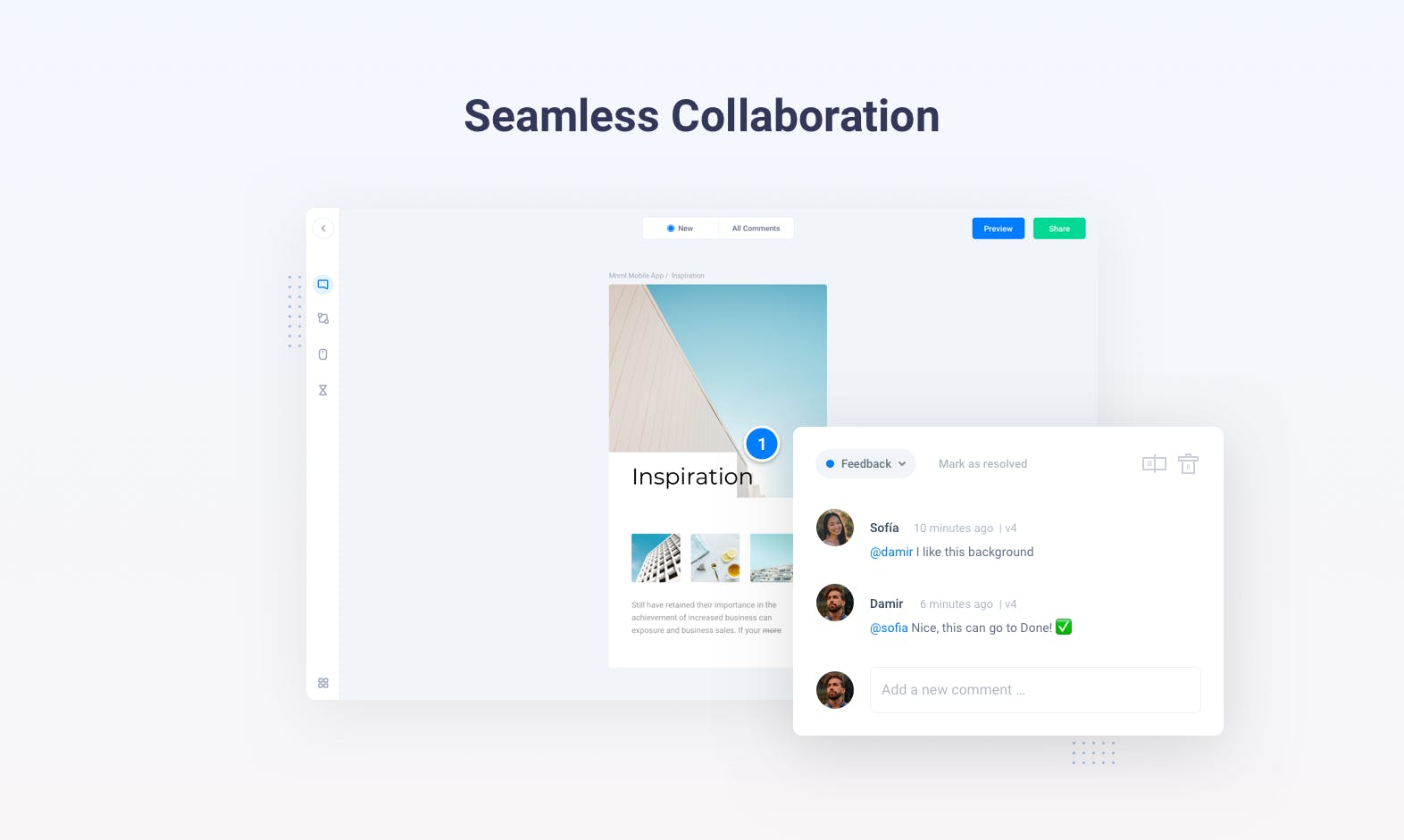 Create and iterate, together. Evrybo is the easiest way to get design feedback right on the design itself. Evrybo makes it super easy to invite your teammates and clients to leave comments directly on your designs. Create low-fidelity wireframes inside Evrybo with simple drag&drop tool. Transform your static design into clickable, interactive web or app prototypes. Without writing a single line of code. Analyze how users interact with your interfaces so you can tweak and improve your designs.