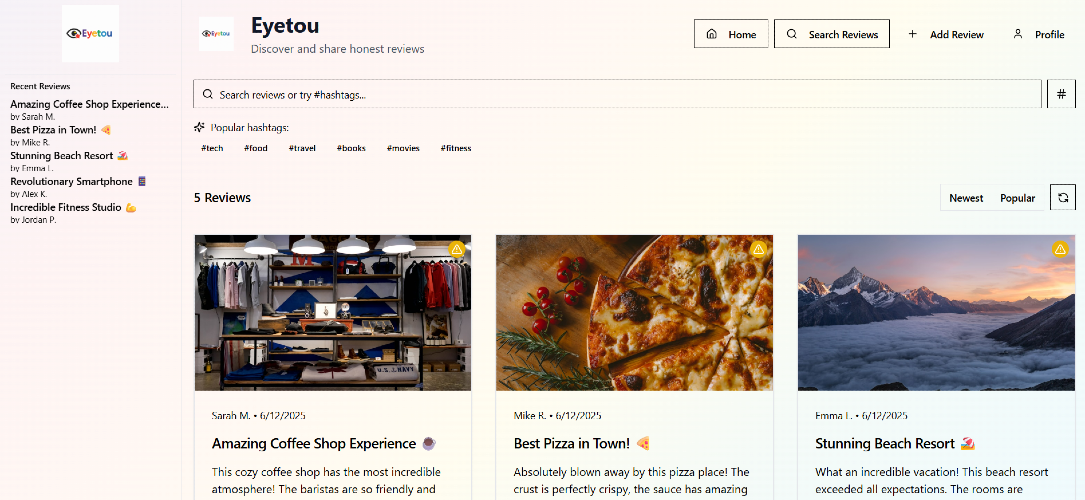Tired of fake, text-only reviews? Eyetou is here to change that. With Eyetou, users can post photo-based reviews of anything – whether it’s a street food stall, a new phone, a boutique store, or an experience. No need to write long essays – just snap, review, and share. Eyetou is designed to bring transparency and authenticity back into online reviews, all powered by real images and real people. It’s quick to use, mobile-friendly, and completely free. We believe that a photo speaks louder than words – especially when it comes to reviews. Explore what others are seeing, trying, and recommending. Start your first review today at https://eyetou.com