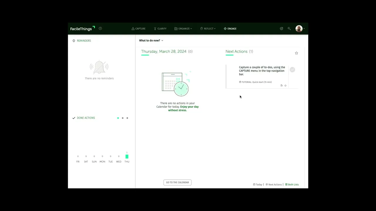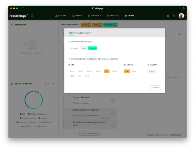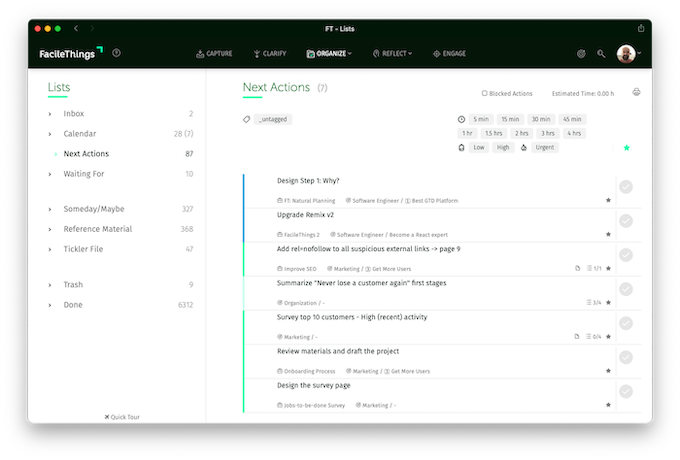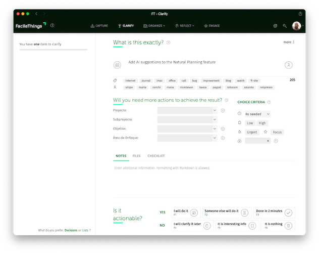 FacileThings is a web application that provides you with the best structure and workflow to get things done. It's based on the Getting Things Done methodology (GTD) and allows you to manage your personal and professional life with minimal stress.