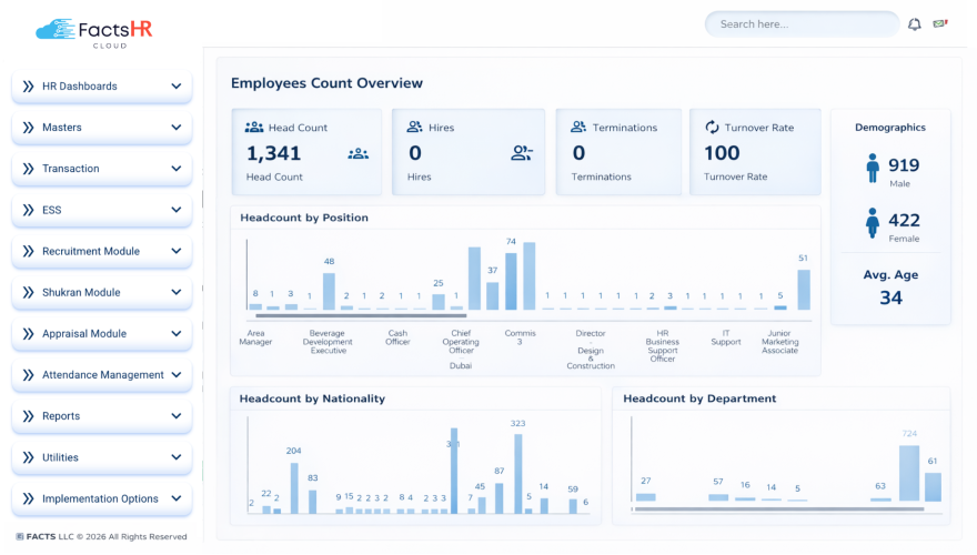 FactsHR Cloud is a UAE-focused HRMS designed to simplify payroll, attendance, employee self-service, recruitment, and performance management on a single platform. Built for growing businesses, it combines flexible configuration with local compliance, helping HR teams reduce manual work and gain clear visibility across their workforce.