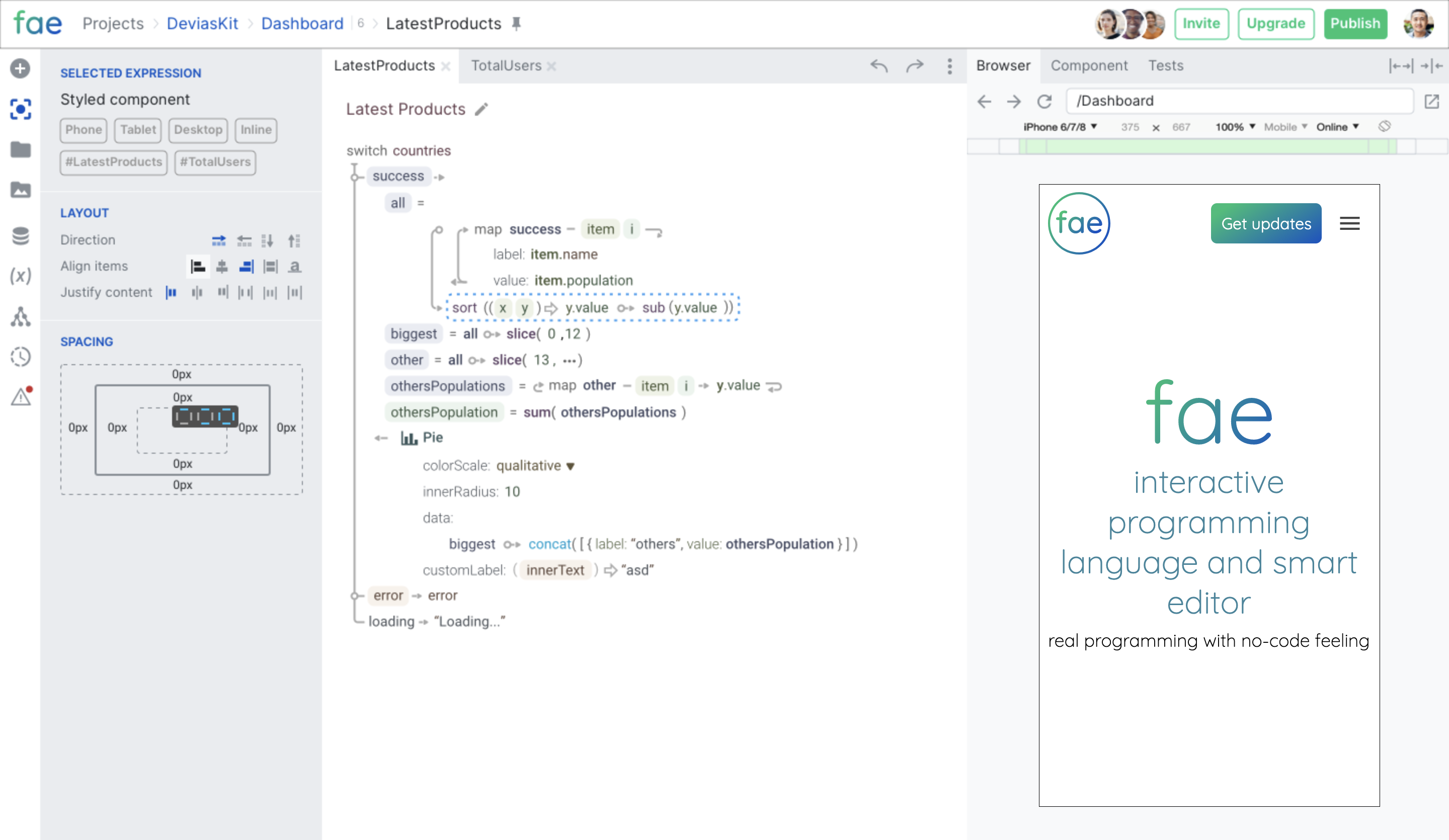 Create the same things as you would with Javascript, just easier. Create web and mobile applications, design systems, production prototypes, server-side logic. Highly compatible with React and Javascript, and possible to insert into existing projects.