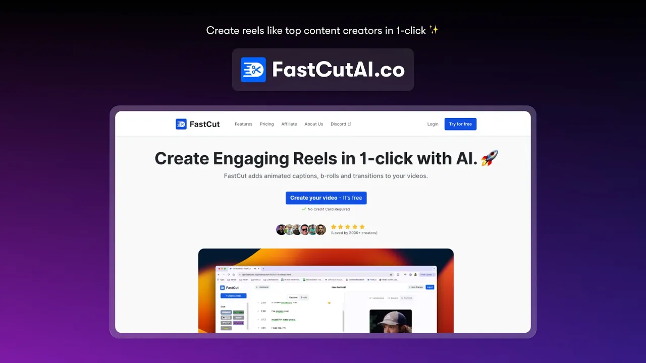 FastCut is an AI video editing tool offering a suite of features including Animated Captions, B-rolls (video overlays), Effects, and Video Resizing to help creators create viral reels/shorts in seconds.