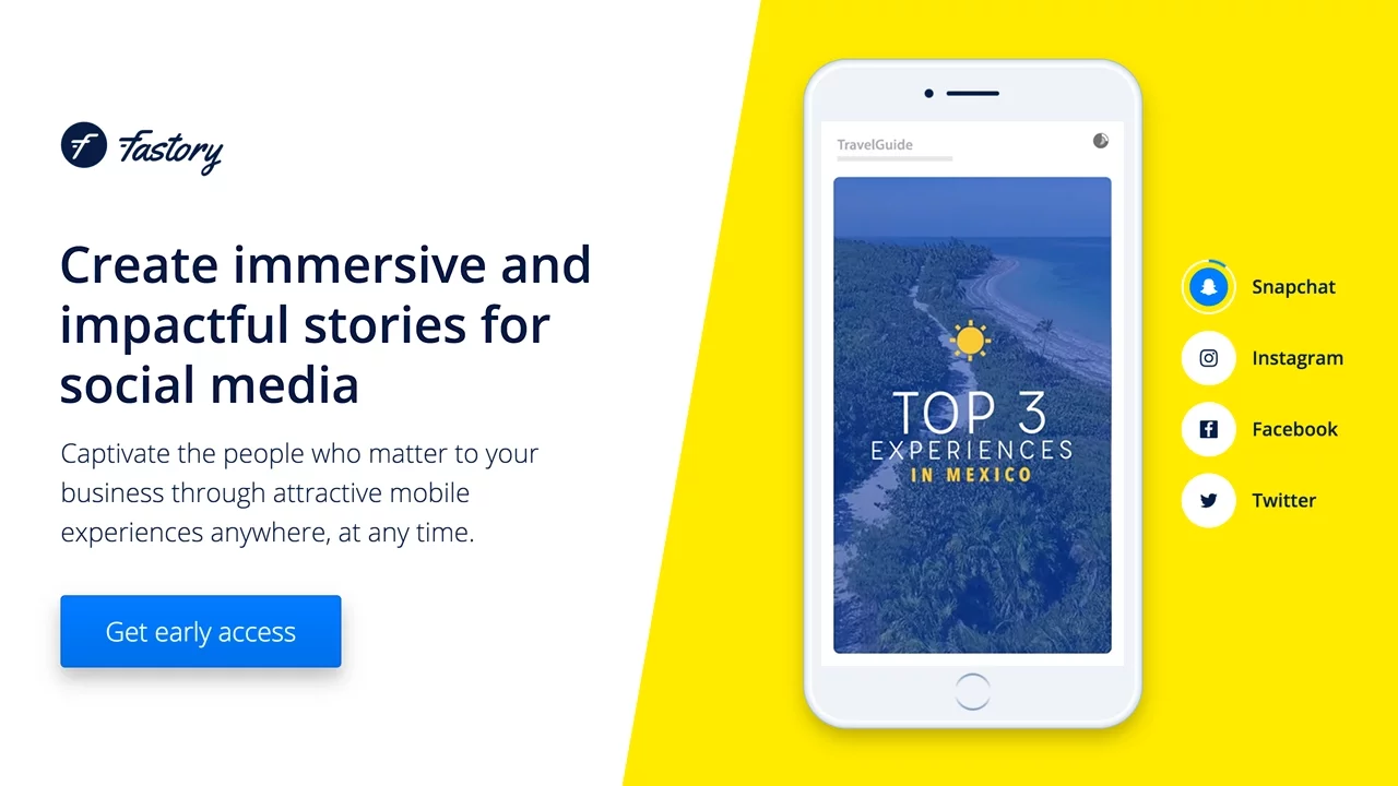 Snapchat, Facebook, Instagram and Whatsapp are creating a world where anyone can instantly share their stories with friends. But what about companies ? For our part, we believe stories is the hottest opportunity for businesses to target Millennials, boost brand awareness and develop strong customer engagement. That's why we're so excited to officially launch Fastory in beta: Fastory is a user-friendly platform where brands and medias can design full-screen mobile stories, integrating immersive and impactful content. We want users to be able to craft compelling stories that play out across major social media channels. How to get early access ? 1/ On the fastory website, add your pro email address in the "request invitation" field 2/ Right after your signup, you'll receive an email asking for you to claim your account : click the link in this email 3/ On the confirm page, fill the short form to let us know how to set up your account.