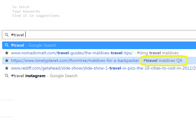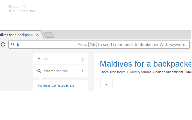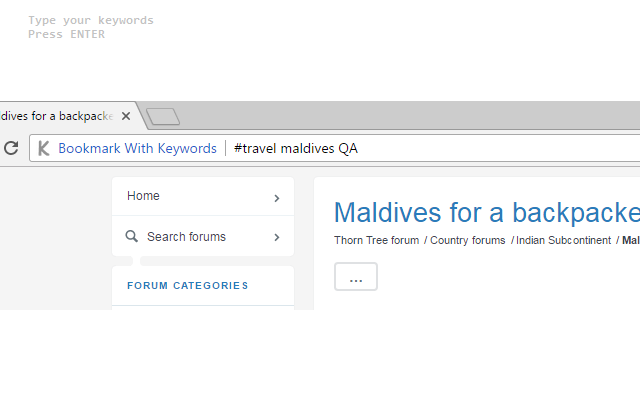 Fastest way to manage Bookmark. Easily and Fastly Manage your URLs with your favorite keywords A lightweight extension to increase your productivity to save bookmarks with your favorite keywords (#blog, #travel, #project, etc). It's completely free and server-less (thus we do not store any of your information). Bookmarks are saved in Chrome browser, thus you can access/search them from any device. ? FASTEST WAY TO BOOKMARK ANY PAGE ? ORGANIZE YOUR ALL LINKS AND PAGES EFFECTIVELY ? NO SIGN-UP REQUIRED ? ORGANIZE YOUR ANY URLs WITH YOUR FAVOURITE KEYWORD ? PARTIAL KEYWORD SEARCH ? USES GOOGLE CHROME BOOKMARK FOR SYNC How To Use? Web page you wish to bookmark, go to address bar: 1. press 'k' key 2. press SPACE key 3. Type your keywords for the webpage 4. press 'Enter' key. Done! Your keywords will be saved along with your bookmark web page. To retrieve the same web page, go to address bar: 1. press 'k' key 2. press 'SPACE' bar 3. enter your keywords 2. web page URL with same keywords will start appearing in the suggestion below If you like our extension then don't forget to share your valuable ratings and review.