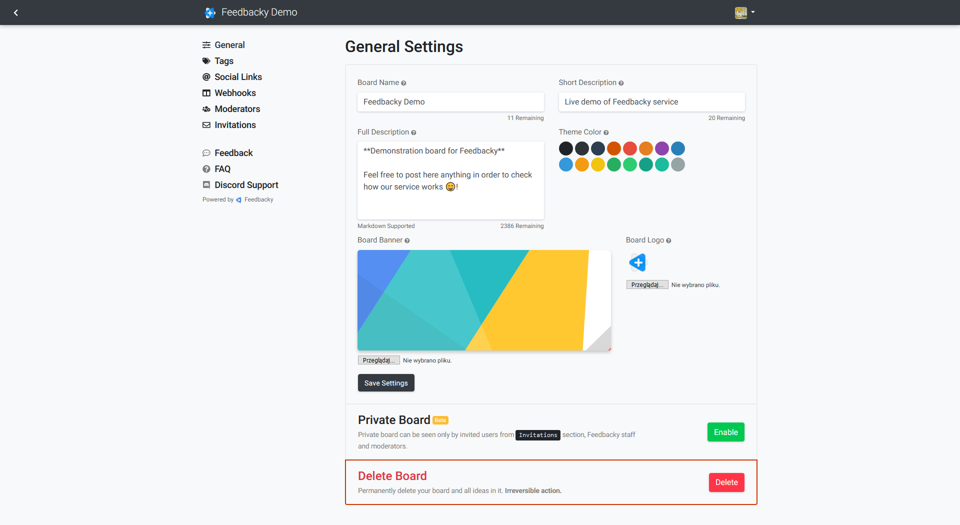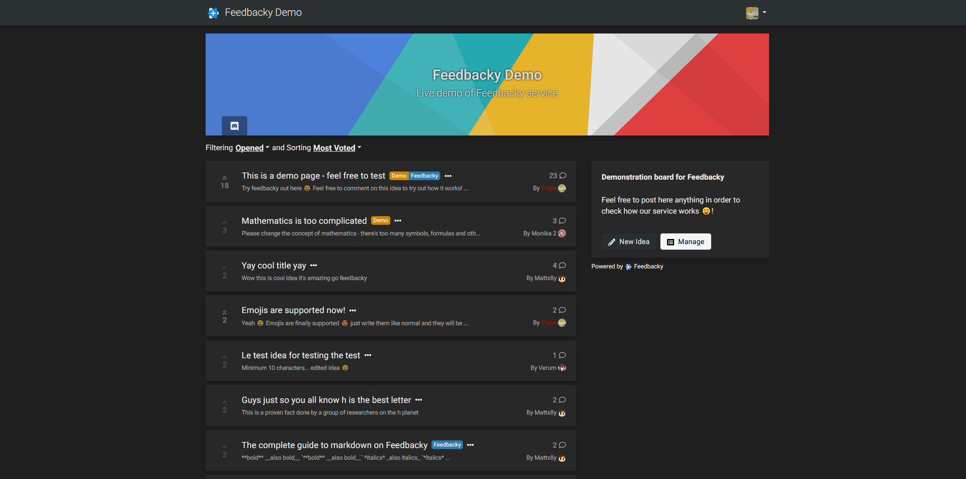 Free web app for collecting and managing customers' feedback. Provides both SaaS option and self-hosted one via GitHub repository. The app includes moderator management tools for feedback, dark mode and login support with popular service providers like GitHub, Google or Discord.