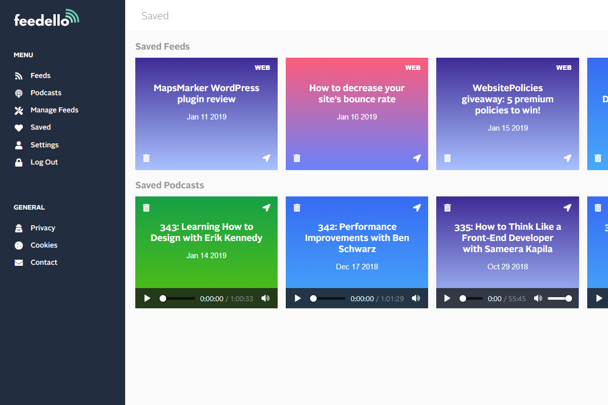 Feedello is a beautiful way to read your feeds and listen to your podcasts. RSS feeds and Podcasts have gained in popularity once again, Feedello allows you to manage, save, read and listen all in one place. Never miss a story.