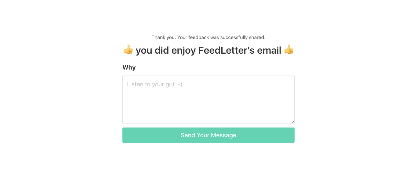 A simple feedback system for your newsletter using a minimal 2-step process to gather feedback from your readers. The tool reduces friction to the minimum, so your readers will actually give you feedback on your newsletter emails. You gain insights and can improve your offer.