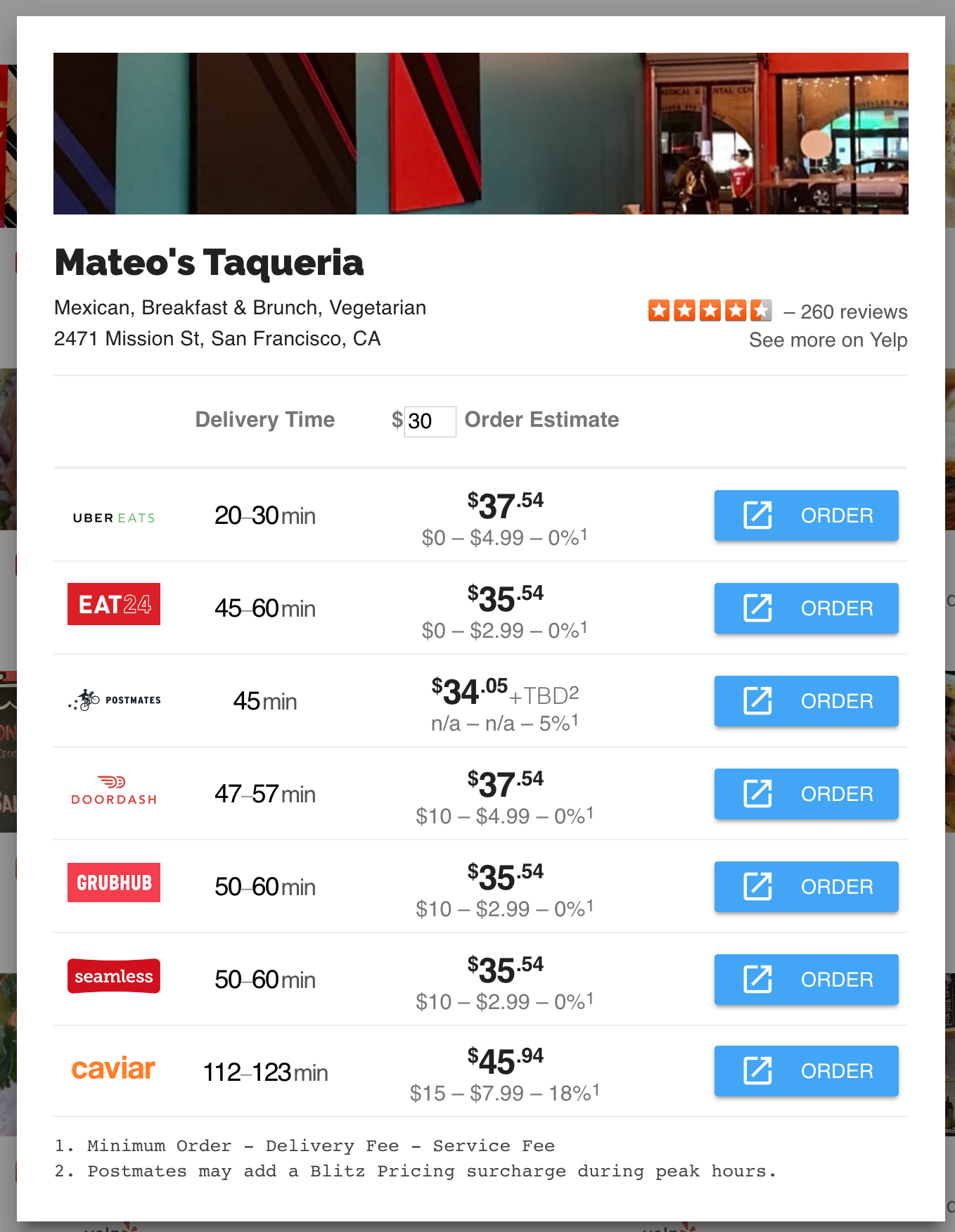 FeedMe searches across all the delivery services and aggregates all the choices for you. It'll let you compare the different restaurants and services to find the best option. We just launched recently and we'd love any feedback.