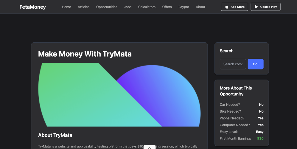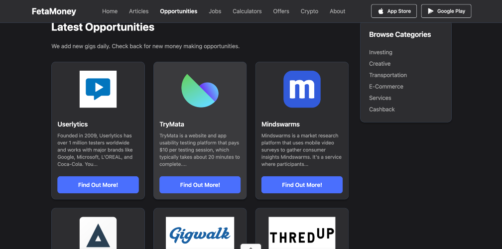 FetaMoney is a powerful platform designed to help you discover legitimate ways to earn money online and build new income streams. Whether you’re looking for a side hustle, flexible gig work, passive income ideas, or remote opportunities, FetaMoney makes it easier to find real options that fit your lifestyle and schedule. The platform curates a wide range of opportunities so you can stop wasting time searching across dozens of websites and start focusing on what actually pays. Instead of traditional job boards filled with long application processes and rigid employment structures, FetaMoney focuses on modern ways to earn. The platform highlights freelance gigs, remote work, survey platforms, cashback programs, creative side hustles, and other opportunities that allow you to earn money on your own terms. A Curated Marketplace of Income Opportunities FetaMoney aggregates hundreds of opportunities across multiple categories, helping users discover new ways to earn without spending hours researching. From freelance work and digital services to app-based income platforms and investment opportunities, everything is organized so you can quickly explore what interests you. Each opportunity is reviewed and categorized to help you understand what’s required, how difficult it is to start, and how much you could potentially earn. For example, some platforms allow you to earn money testing apps or websites, while others pay you for driving, renting assets, or completing online tasks. Built for the Modern Side Hustle Economy The gig economy has created more opportunities than ever to generate income outside of traditional employment. FetaMoney acts as a discovery engine for these opportunities, helping users quickly identify platforms and services that match their goals. Whether you want to: Earn extra cash in your spare time Build multiple online income streams Discover new freelance platforms Explore passive income ideas Find flexible remote work FetaMoney brings everything together in one place. Save Time and Focus on What Works Researching ways to make money online can be overwhelming. Many sites promote outdated methods, scams, or opportunities that aren’t worth your time. FetaMoney simplifies the process by highlighting legitimate opportunities that people are actually using today. The platform organizes opportunities by category—such as investing, creative work, services, transportation, e-commerce, and cashback programs—so you can quickly filter and discover options that align with your interests and skills.