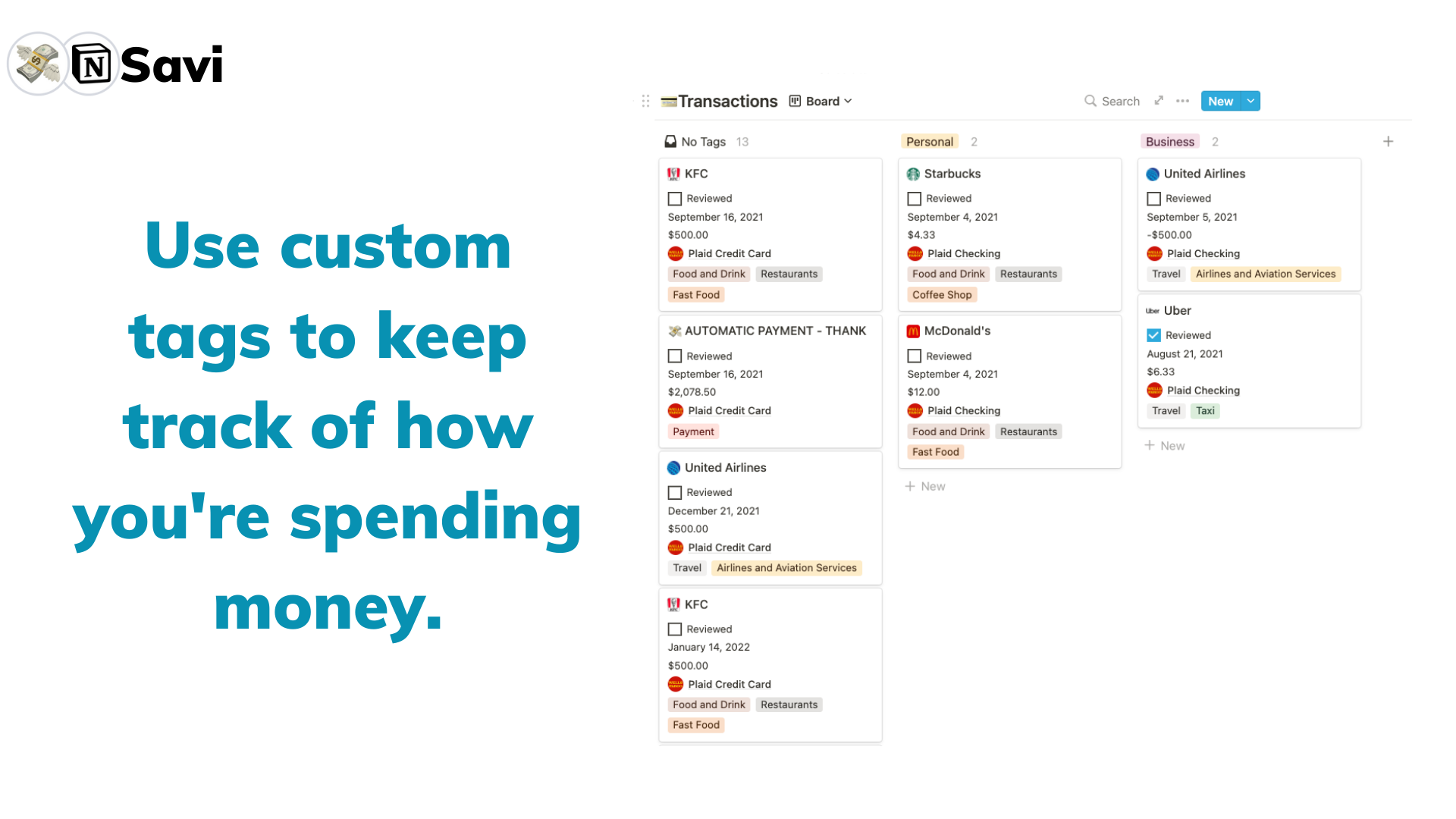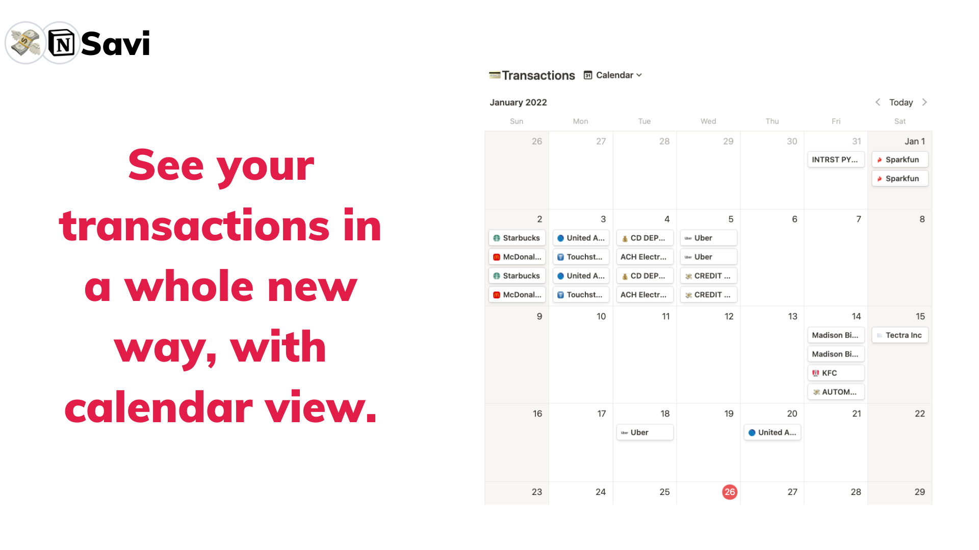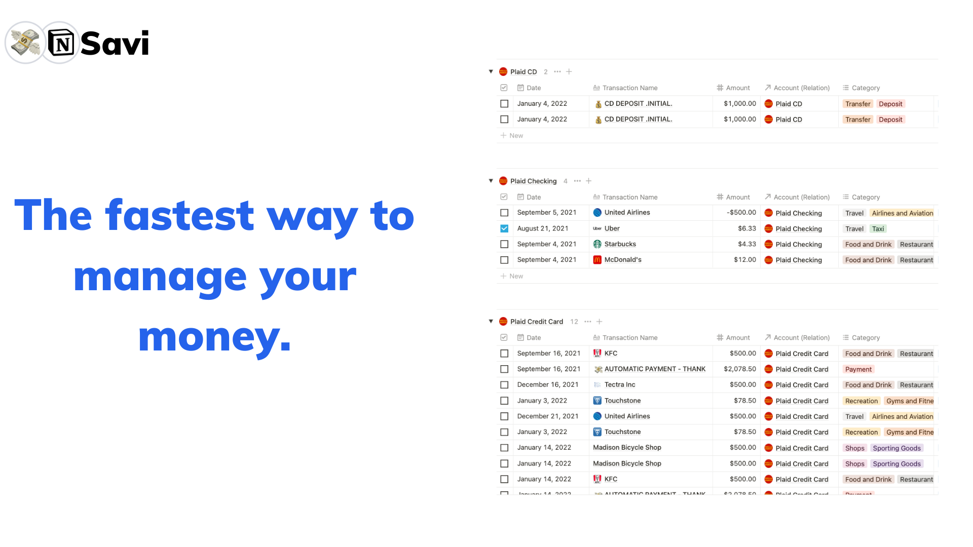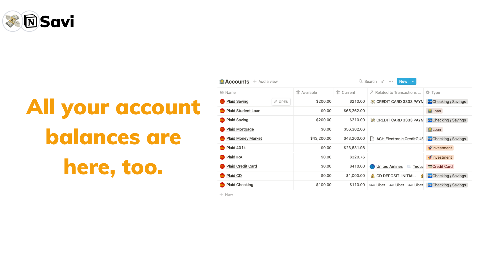 Your financial transactions in Notion, synced automatically. Keep track of where your money is going, organize your expenses, and see everything in one place. Savi imports your daily transactions and account balances from over 11,000 financial institutions and adds them to your Notion database automatically. Check out https://www.finotion.app/ to learn more!