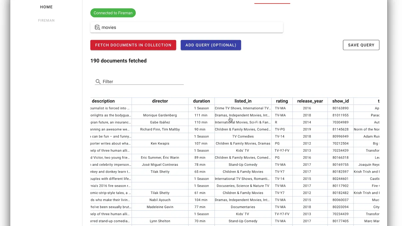 Hi! I'm Fireman Easily manage Firestore. View, query, and edit in 3 seconds. # Simple Easily manage Firestore and user list # Seamless Works with your existing Firestore # Security Private Key and queries do not leave your machine