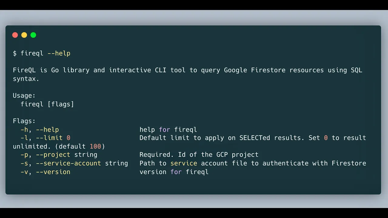 FireQL is the Golang library and interactive CLI tool to query the Google Firestore database using SQL syntax. It is built on top of the official Google Firestore Client SDK that will allow running queries Cloud Firestore database using SQL syntax.