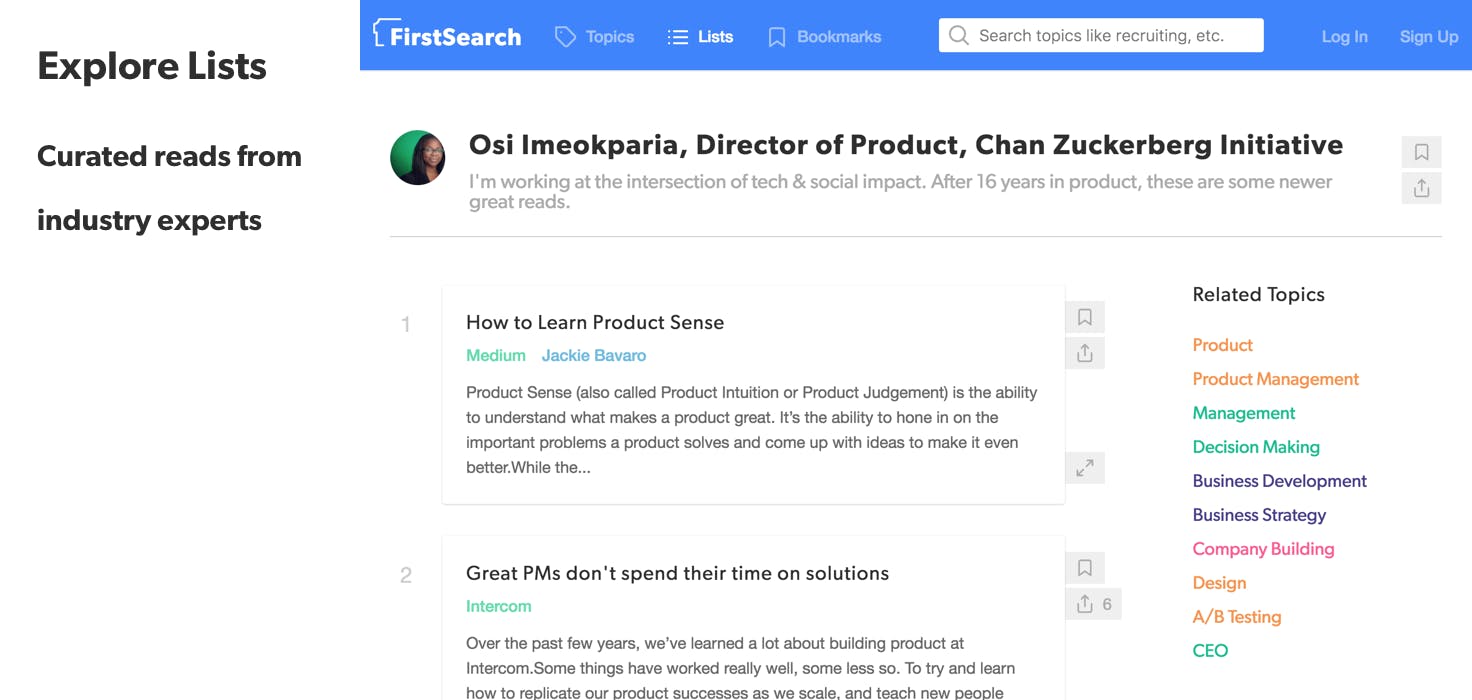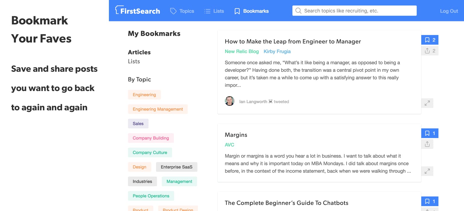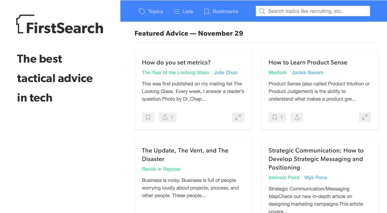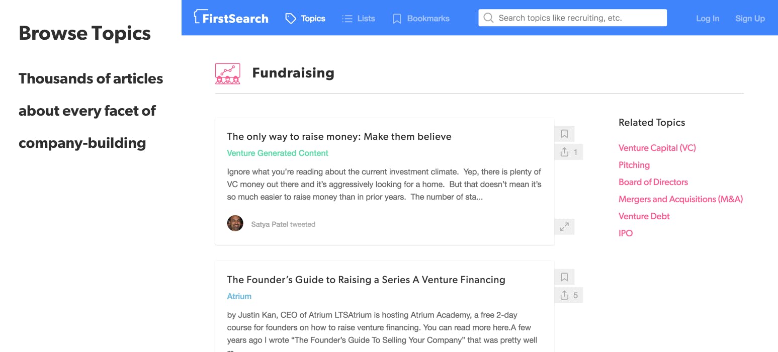 First Search is the largest database of curated, high-quality advice for building startups ever created. We've vetted, tagged and organized 10,000+ articles about every facet of company-building, written by the best minds in tech, so that you can find the information you need right when you need it.