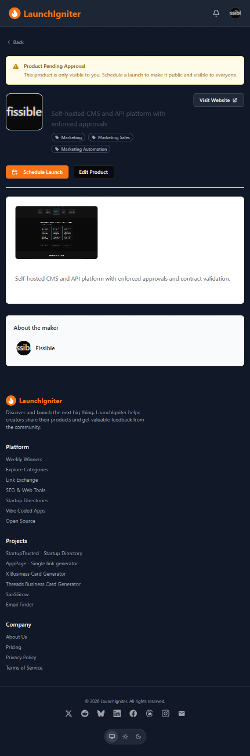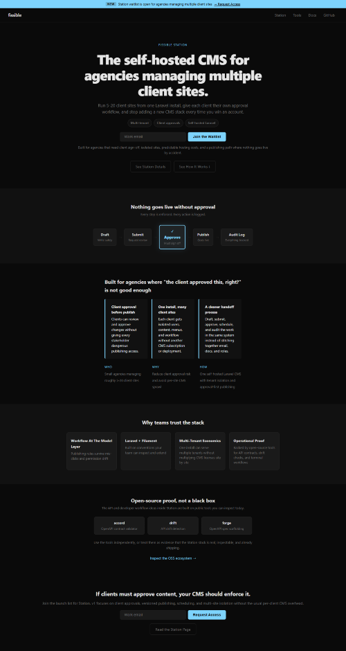 Fissible Station is a self-hosted Laravel CMS built for agencies managing multiple client sites from a single install. It enforces client approval before anything goes live, isolates each tenant's content and users, and backs every action with a full audit log, so "the client approved this" is never just an assumption.