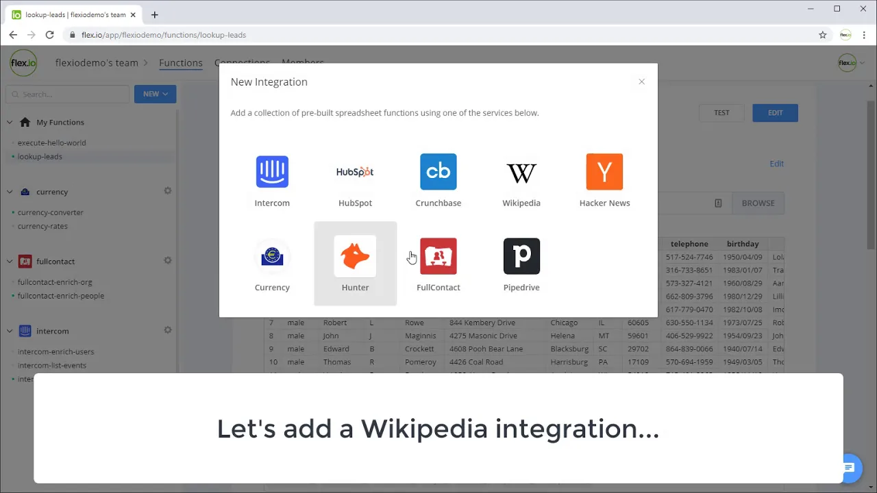 Import on-demand data from your favorite web services, directly in Excel and Google Sheets. Flex.io is a platform that translates data stored in cloud services like Wikipedia, Intercom, and GitHub into simple import functions that you can use without leaving your spreadsheet. Easily pull in data from APIs or external tables or files or even other spreadsheets with built-in integrations. Or, you can go off-road and create your own functions with Python or Node.js. * Instant Integrations. Get on-demand lists and enrichments from web services out-of-the-box. Enrich lead lists with services like Hunter, FullContact, and Crunchbase. Get custom lists of data from CRMs like Intercom, Pipedrive and HubSpot. And more… * Instant Table Extracts and Lookups. Pull in refreshable extracts and lookups from your own data systems. Easily snap together key value lookup functions from file stores like Dropbox, Box and S3. Broadcast data extracts to your end users from master files in Google Sheets, Postgres or MySQL. * Roll your Own. Build your own custom spreadsheet functions with Python or Node.js. Go off-road and access just about any data with your own code and then easily document your custom functions with YAML. Share functions with your team without sharing your credentials. How does it work? Instead of using a traditional function like =SUM() to add up a column of numbers, you simply use the Flex.io function =FLEX() to pull in data from remote data sources. For example, here is a function that gets data from the enrichment service FullContact: CELL A1: | [email protected] | SYNTAX in A2: =FLEX("team/fullcontact", A1, "full_name, twitter_url") RETURNS new data to cells A2:A3 | [email protected] | Bill Gates | https://twitter.com/BillGates | We're always looking to add new integrations so if you are missing something you'd like to see, just contact us and we'll do what we can to help! Thnx.