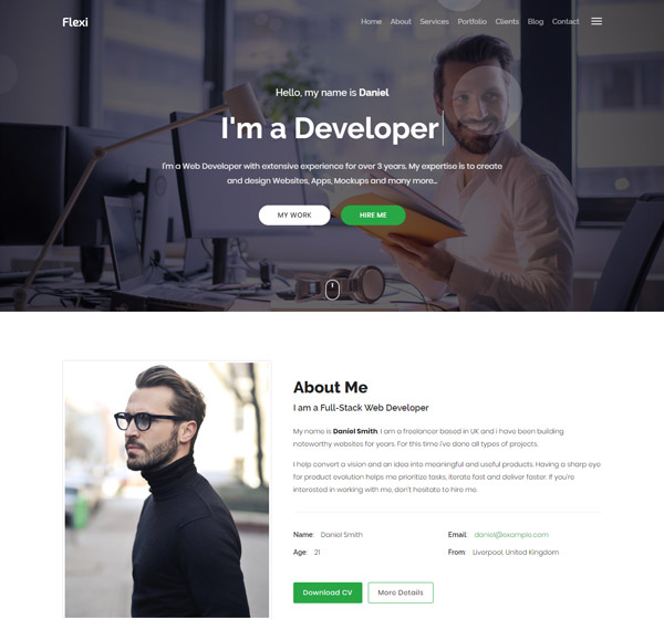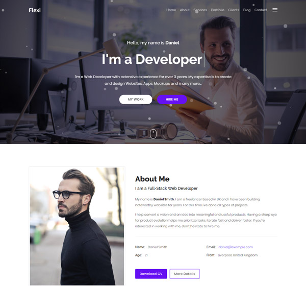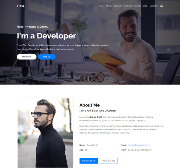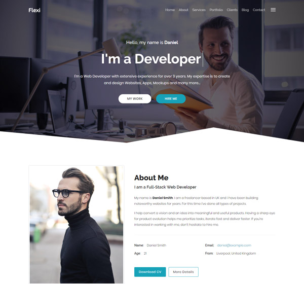Flexi is a Unique, Fully responsive, Creative and Modern Portfolio Template built using Bootstrap 4, suitable for any Designer, Developer, Coder, Freelancer, Photographer or any Creative person that needs a professional way to showcase their projects and services with a super good User Experience.
