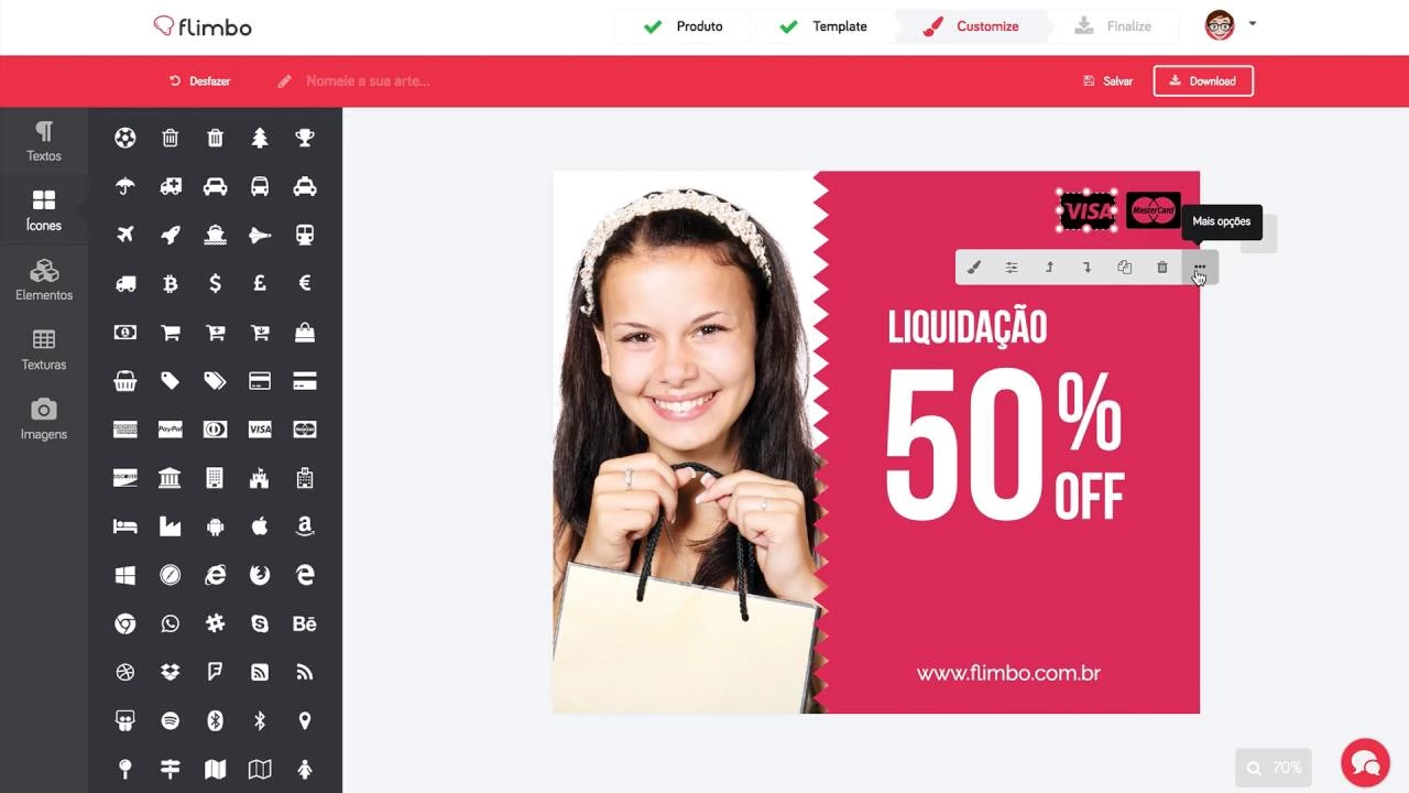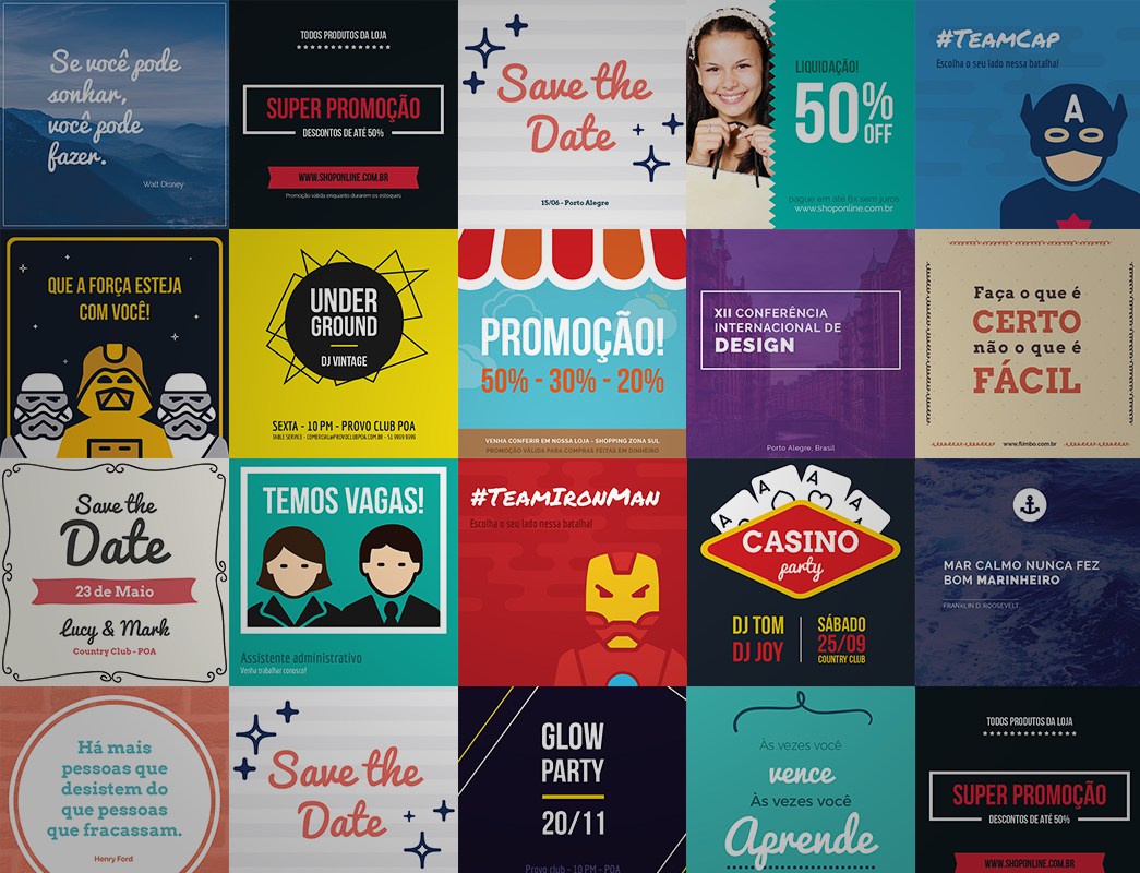 Flimbo allows any one to create beautiful graphical designs through templates, ready images, icons and graphics in a very intuitive drag-and-drop interface. We support printed and digital media with tons of templates for you to choose and use as a start for your art. The templates were built by specialists seeking to make a great impression for your brand.