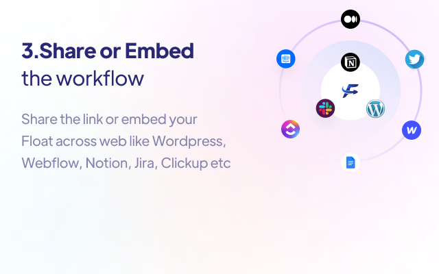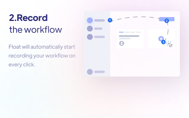 Share interactive walkthroughs for any website in seconds. No more manually writing process guides or copying and pasting screenshots to share knowledge with your team. Just Add Float to your chrome browser and turn any process into a process guide in seconds. Create Workflow in 3 Easy Step Step 1. Go to the URL you want to capture. Step 2. Click on the Float extension to Record your Workflow Step 3. Click on the Stop Capture to end. KEY FEATURES ✨ Automatically generated step-by-step workflow 🔗 Easy link sharing 🌐 Embed your workflow in Notion, WordPress, Google Docs, etc. Famous Use cases of Float ✅ Dashboard tour - Create a Dashboard tour in seconds with Float. ✅ Onboard new hires - Get new hires up to speed faster. ✅ Product demo - Create a "try before you buy" guide with Float. ✅ Simplify product documentation or integration guide.
