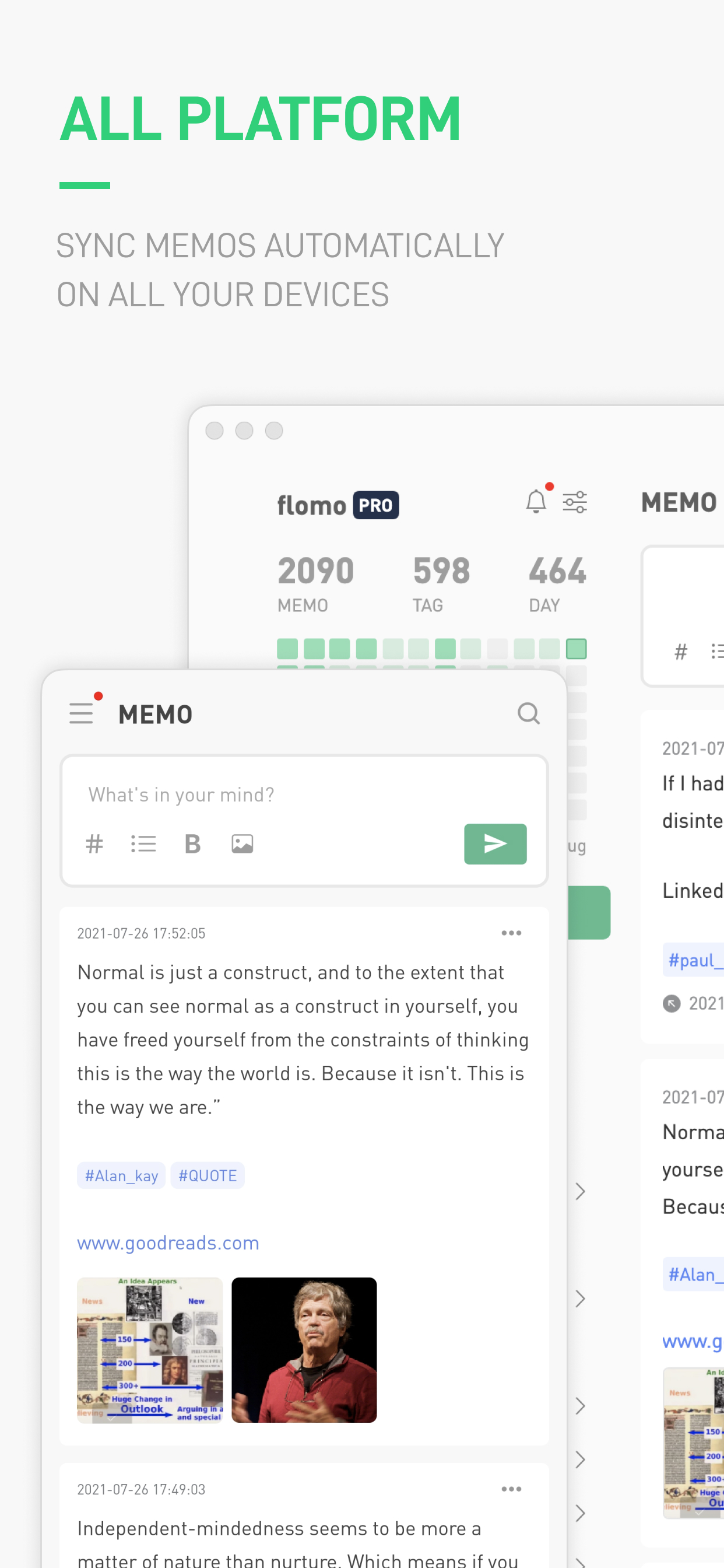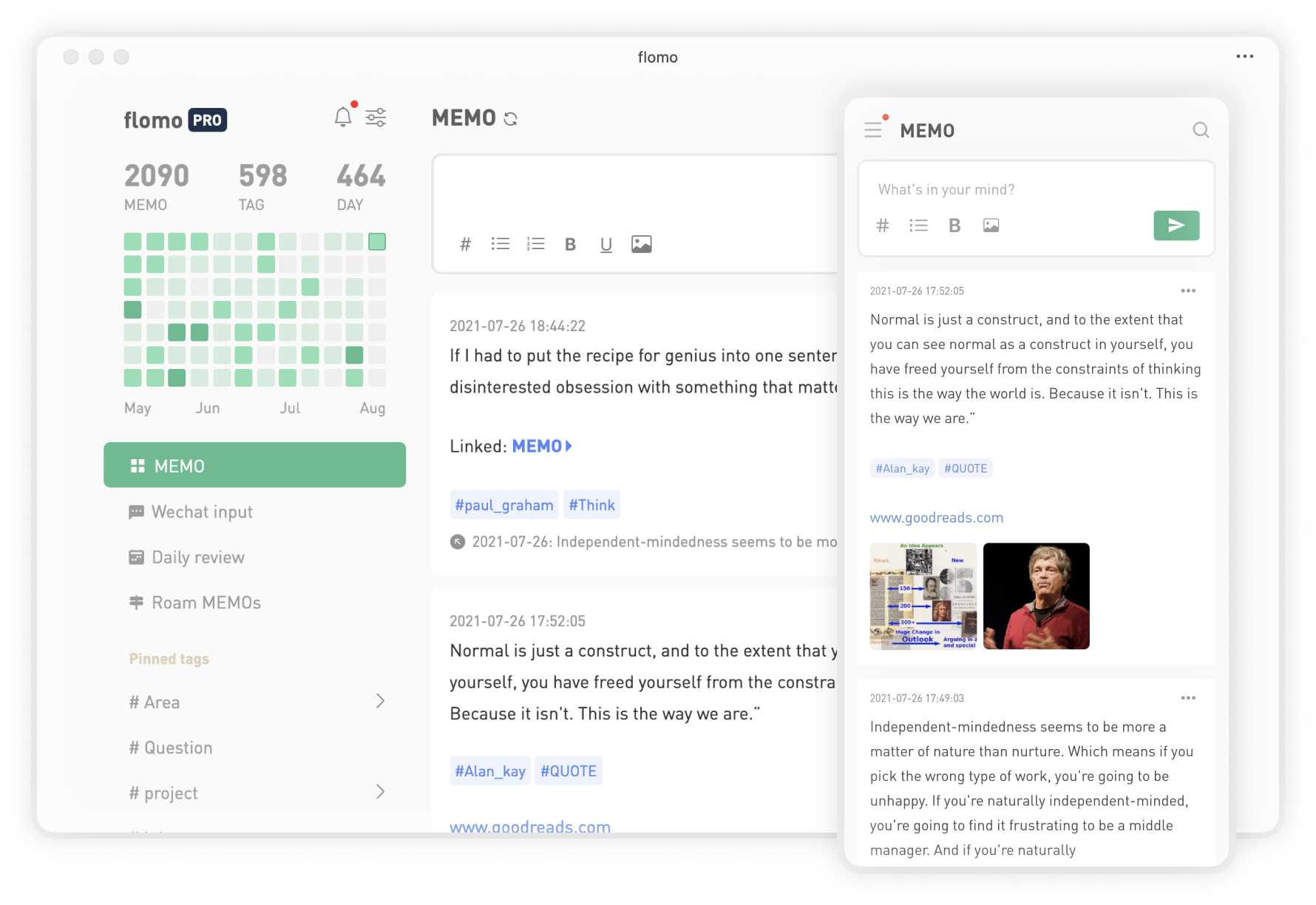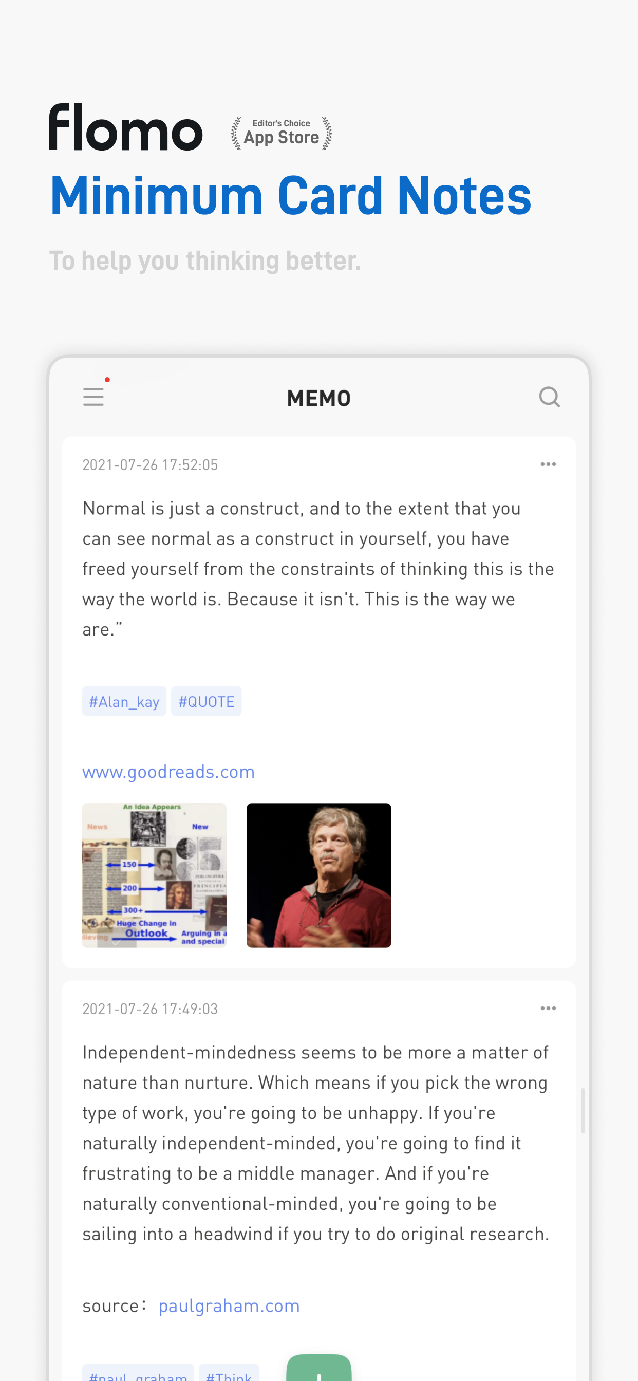 flomo is a minimal memo-taking tool based on zettelkasten method. Both the textbox and the API in flomo provide a seamless and rapid memo-taking experience. With daily review and cloud syncing, you can check and write memos across all platforms.