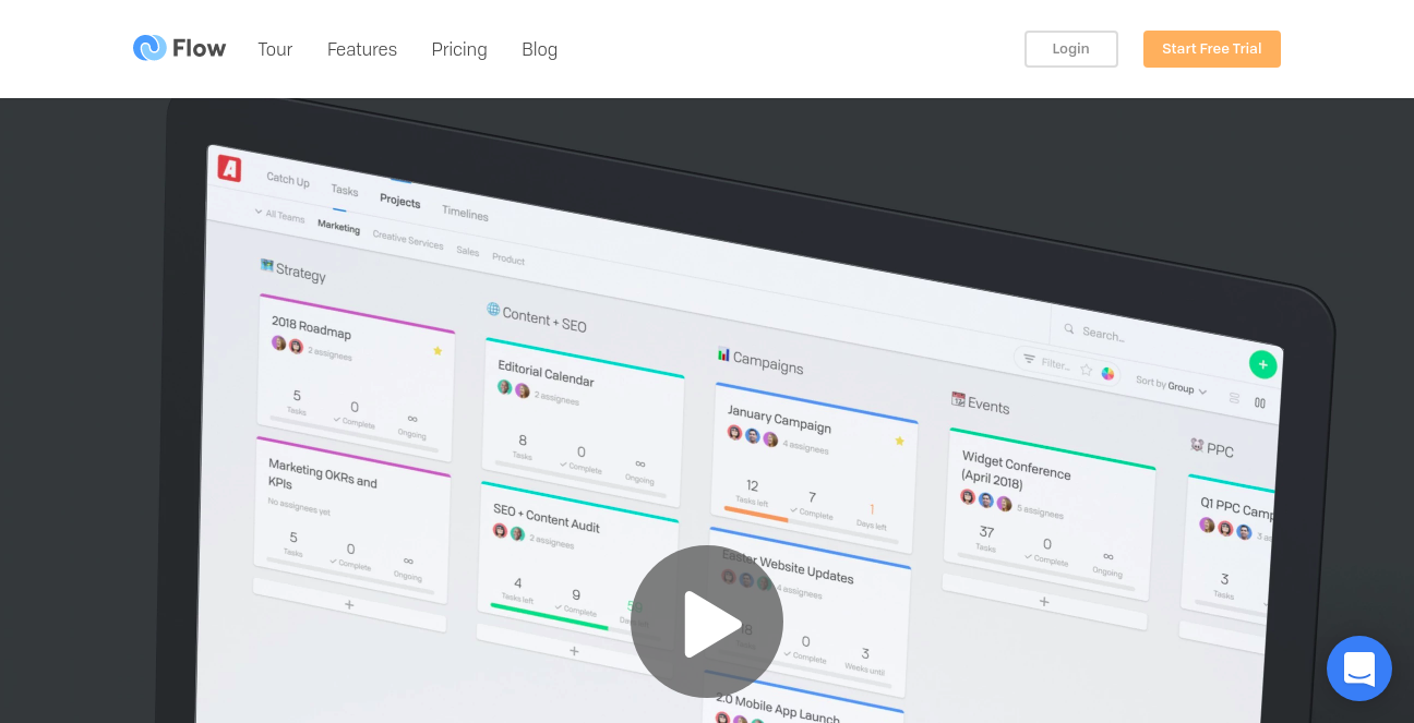The easiest way to manage any project with your team Flow’s flexible tools are designed for any project or workflow. Plan ahead, set priorities and track projects from start to finish. From simple checklists to kanban boards, we’ve got you covered. Get instant, clear visibility into all of your team’s work Take the 30,000 foot view and track the progress of all your team or company's initiatives with Flow's Projects Dashboard. Plan ahead with beautiful Project Timelines Plan ahead by day, week, or month, and see project status at a glance. Search and filter to focus in on anything form a single project to an individual person's workload. View, organize and prioritize all of your team’s tasks Manage work using task lists, visual cards, or on the calendar. Keep track of your own to-do list, and stay on top of any teammate or report’s workload. Easily balance workloads and manage resources See who’s busy, and who’s not, this week — or next month. Quickly re-assign tasks and rebalance