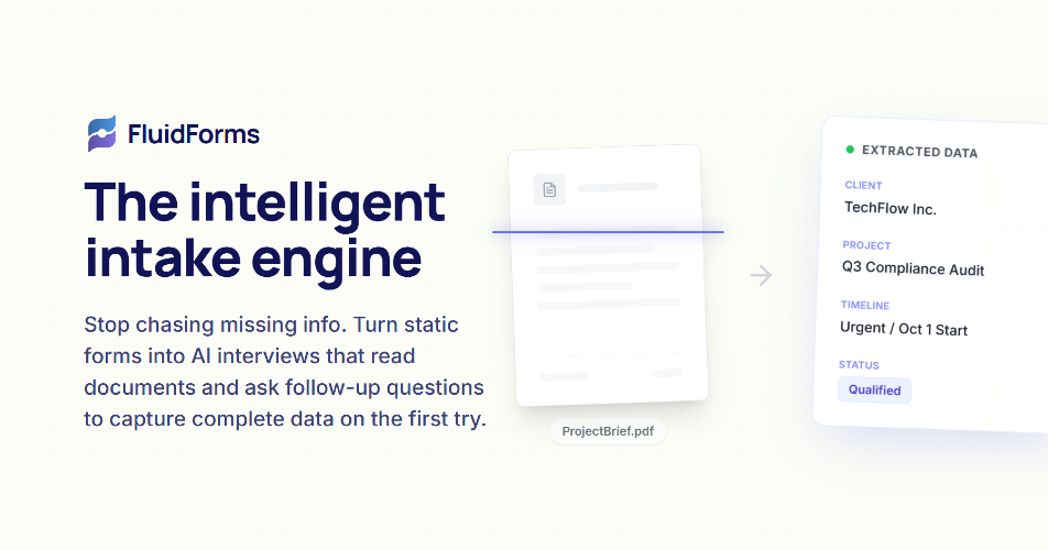**FluidForms: The AI Form Builder That Interviews Your Users** Traditional web forms are rigid, passive, and often result in incomplete data that forces your team into endless back-and-forth emails. FluidForms replaces static data entry with an "Intelligent Intake Engine" that treats every submission as a dynamic conversation to capture complete, structured data on the first try. Instead of relying on clunky "if/then" branching logic, FluidForms acts as an automated screener with a few unique capabilities built for modern workflows: * **Deep Document Intelligence:** It doesn't just store file uploads. Users can drop in messy, unstructured files—like PDF reports, resumes, or even audio and video. The AI instantly parses the files, extracts key entities, and auto-fills the relevant form fields. * **Adaptive AI Interviews:** If a user provides a vague answer, the AI recognizes the missing context and autonomously asks natural, real-time follow-up questions to clarify—just like a human agent would. * **Zero-Friction Creation:** You can spin up complex intake flows in seconds just by describing your ideal workflow in a simple text prompt. * **Developer-Friendly Outputs:** It handles the messy reality of human inputs and pushes perfectly structured JSON data directly into your existing stack via Webhooks, API, Zapier, Make, or n8n. Whether you are building an automated lead qualification flow, screening job candidates, or handling complex client onboarding, FluidForms allows you to mix standard static input fields with conversational AI agents in a single, seamless interface.
