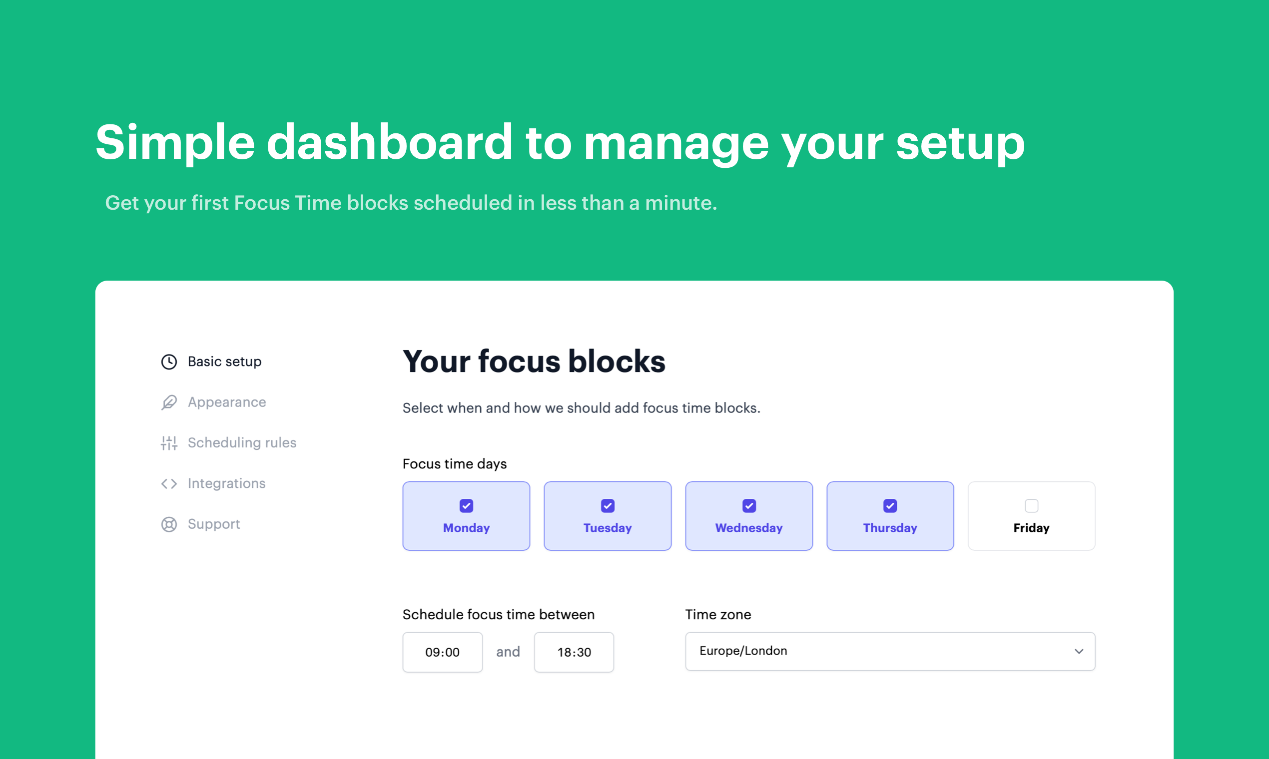 Keep time for deep work, even as your calendar fills up. Focus Time automatically schedules time for deep work, around your other meetings. Focus Time schedules focus time blocks for you around the meetings in your calendar, and automatically updates within a few seconds when new meetings get added. No more manually shifting things around. We'll mark your focus time as free time for other people to book meetings over as long as there's multiple moments in the day available for focus time. And you can connect Slack to automatically turn on 'Do not disturb' when your focus time starts.