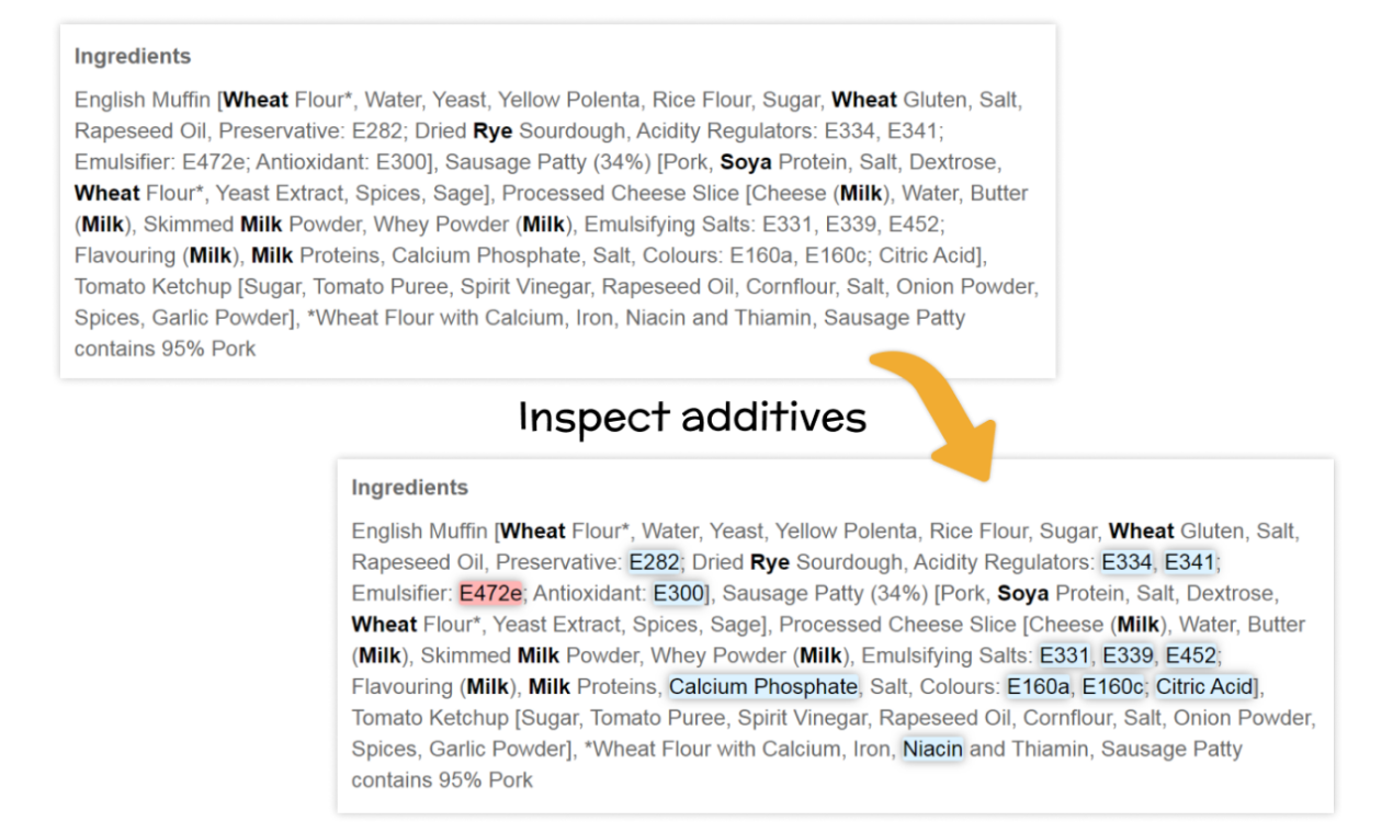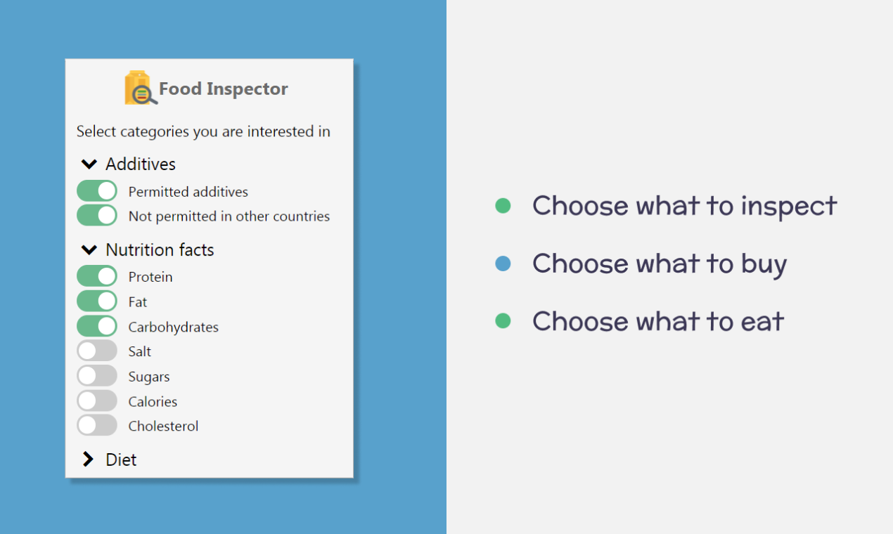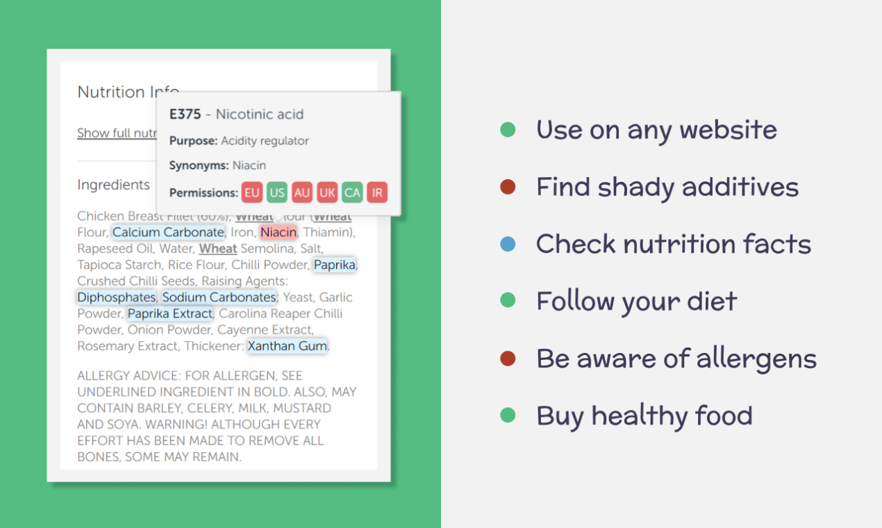 Food Inspector is an online shopping assistant that inspects your food for harmful/healthy ingredients. Main features: • Finds additives and shows its details. Filters additives not permitted in other countries. • Highlights nutrition facts: protein, fat, carbohydrates, salt, sugar, calories, cholesterol. • Checks labels for your diet: vegetarian, vegan, organic, kosher, non GMO, halal, lent. • Warns you about allergens: wheat, gluten, soy, peanuts, tree nuts, milk, lactose, eggs, fish, shellfish, sesame. • Allows you to choose what ingredients to highlight. • Works on any website, just open your favorite online store and check. You also can filter which sites to exclude.