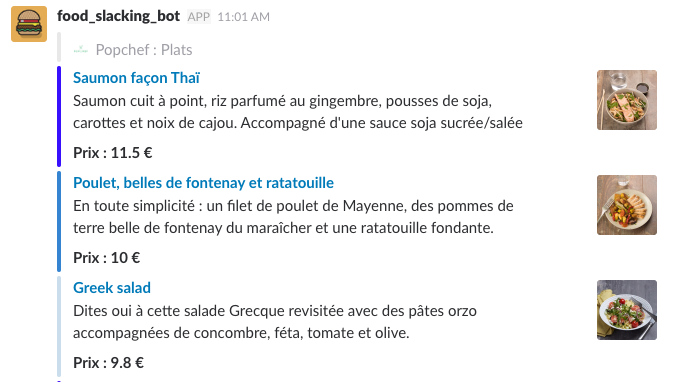 Know what Paris' food delivery service have for you today directly into your Slack team at work ! Supported providers : Frichti, Popchef, UberEats, Foodora, Deliveroo, Nestor, Pickles