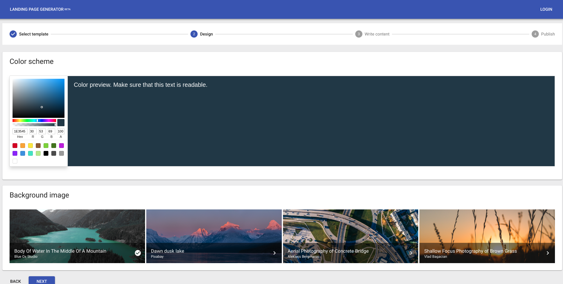 Simple landing page generator aimed at people who don't want to spend time designing pages. First beta version includes. - One design - A few stock photos and possibility to adjust primary color - Lead collection (form with fields for e-mail and name) - Responsive design - Create as many landing pages as you need This is a very early release, any feedback is appreciated.